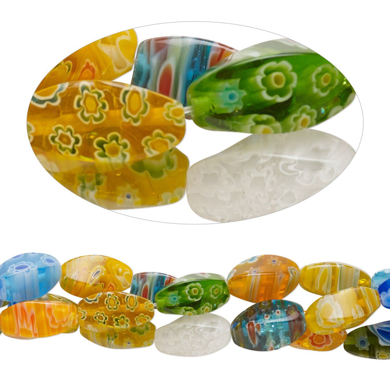 Bead mix, millefiori glass, opaque to transparent multicolored, 16x8mm 4-sided twisted oval with 0.6-0.8mm hole. Sold per pkg of (3) 15-inch strands.