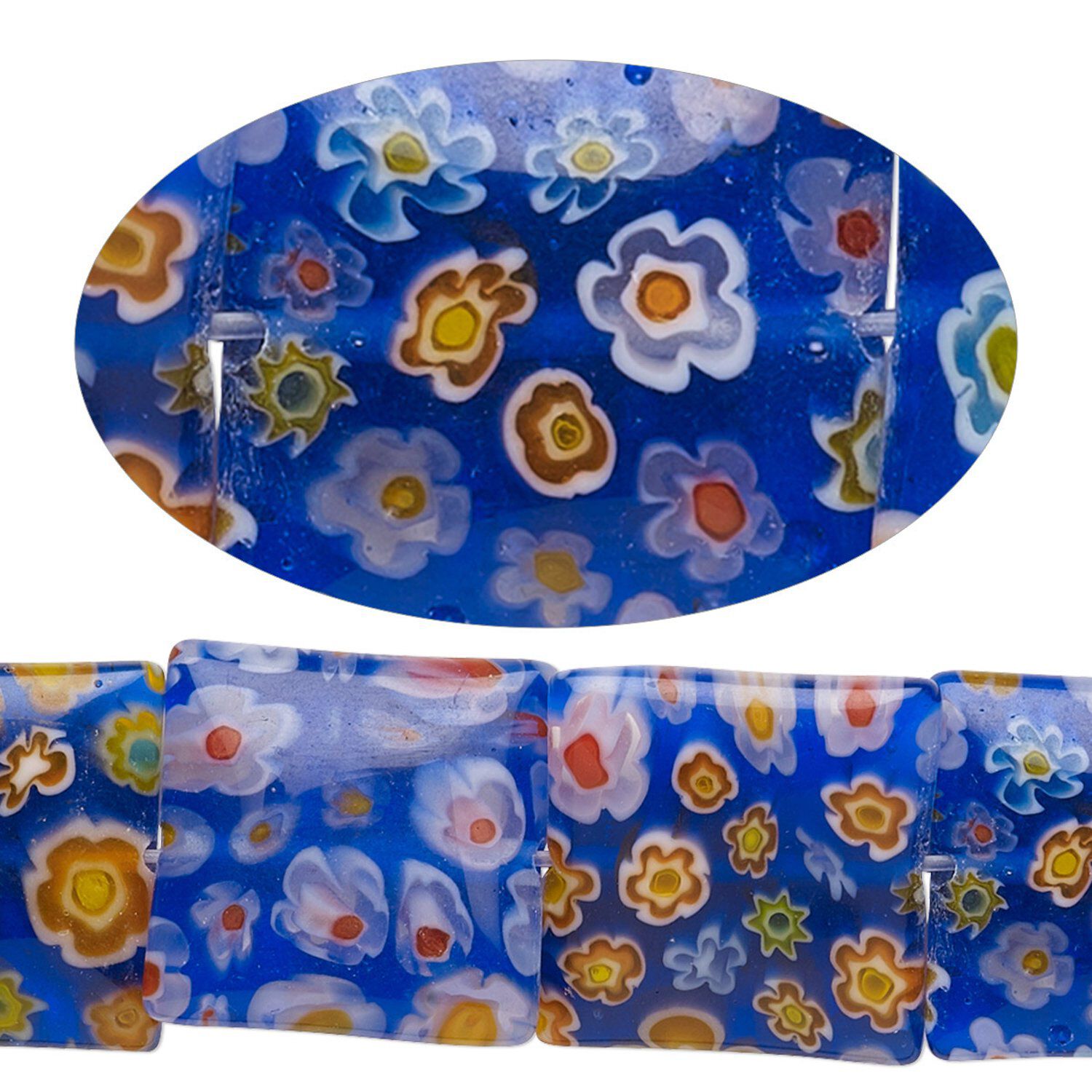 Bead, millefiori glass, translucent cobalt blue multicolored, 16mm puffed square. Sold per 15-inch strand.