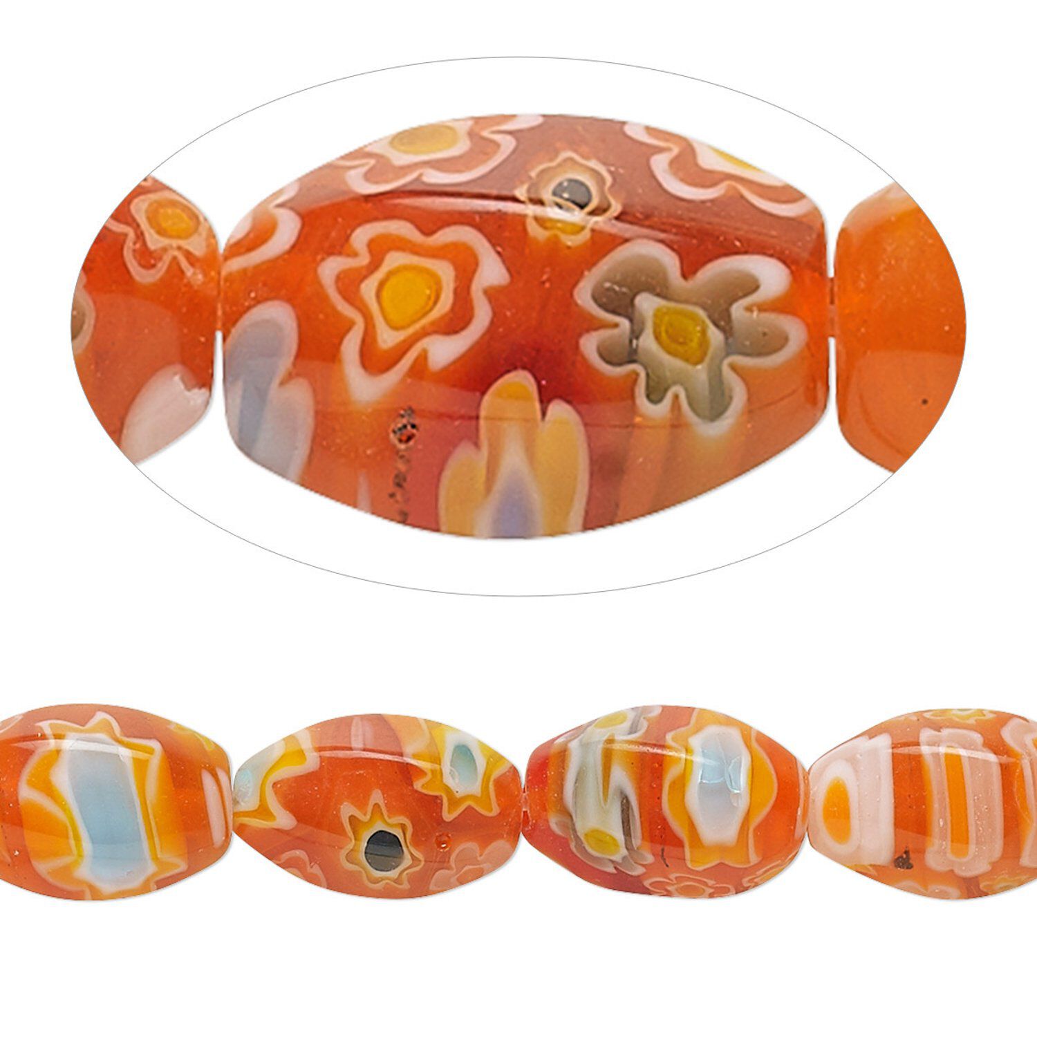 Bead, millefiori glass, translucent orange and multicolored, 12x8mm 6-sided twisted oval. Sold per 15-inch strand, approximately 30 beads.