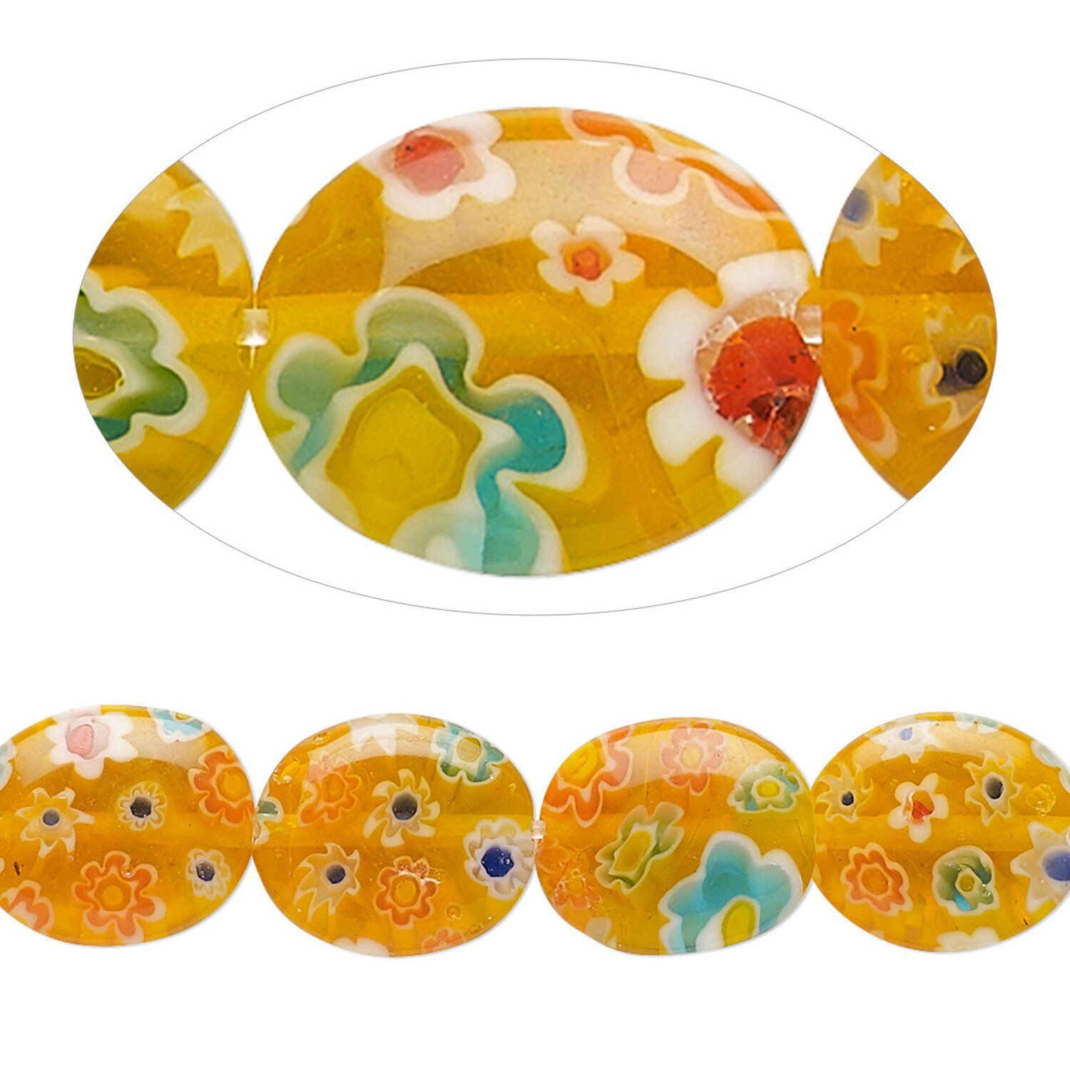 Bead, millefiori glass, translucent orange and multicolored, 12x10mm puffed oval. Sold per 15-inch strand, approximately 20 beads.