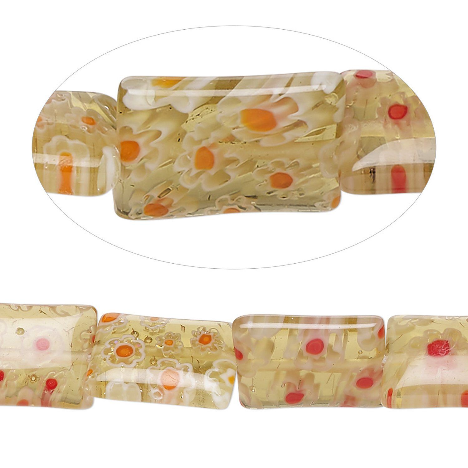 Bead, millefiori glass, translucent amber / peach / white, 14x10mm puffed rectangle with 0.6-0.8mm hole. Sold per 15-inch strand.