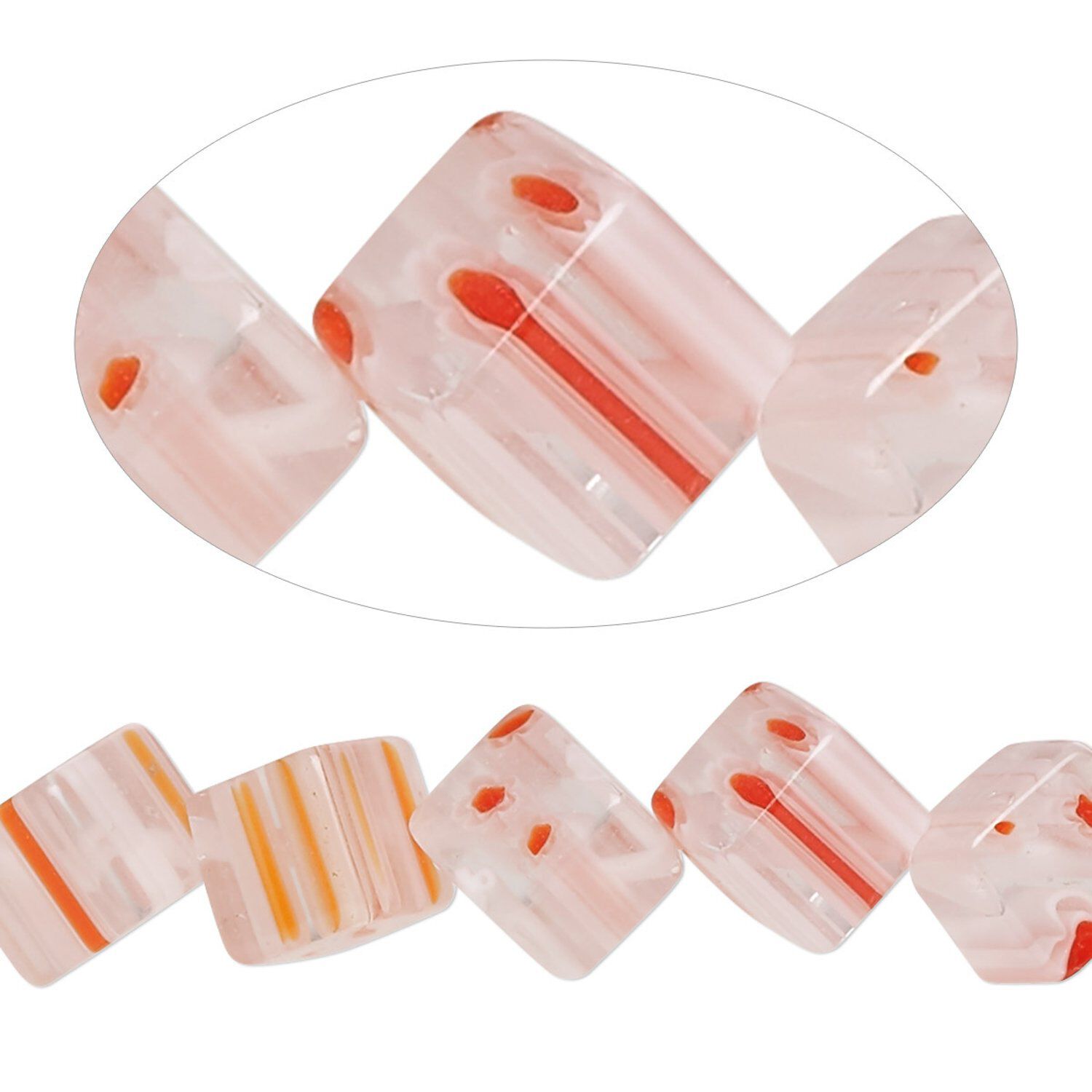 Bead, millefiori glass, translucent and transparent white / clear / orange, 8mm diagonally-drilled cube with 0.6-0.8mm hole. Sold per 15-inch strand.