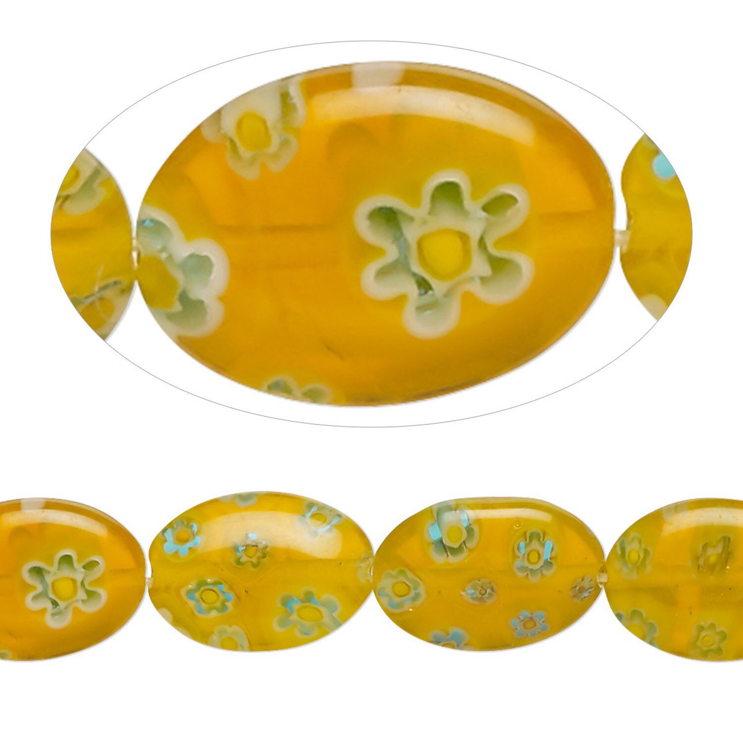Bead, millefiori glass, translucent yellow / blue / white, 14x10mm puffed oval with 0.6-0.8mm hole. Sold per 15-inch strand.