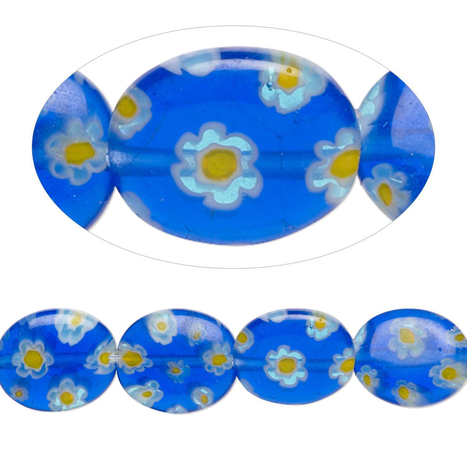 Bead, millefiori glass, translucent cobalt / white / yellow, 12x10mm puffed oval with 0.6-0.8mm hole. Sold per 15-inch strand.