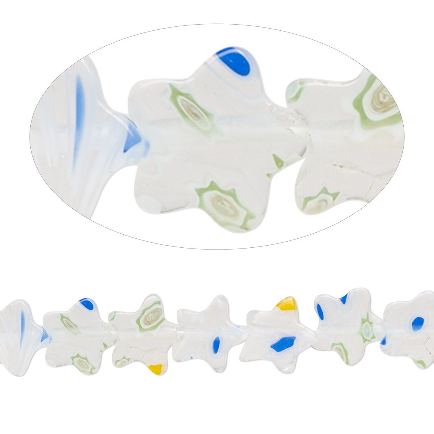 Bead, millefiori glass, translucent multicolored, 8mm flat star with 0.6-0.8mm hole. Sold per 15-inch strand.