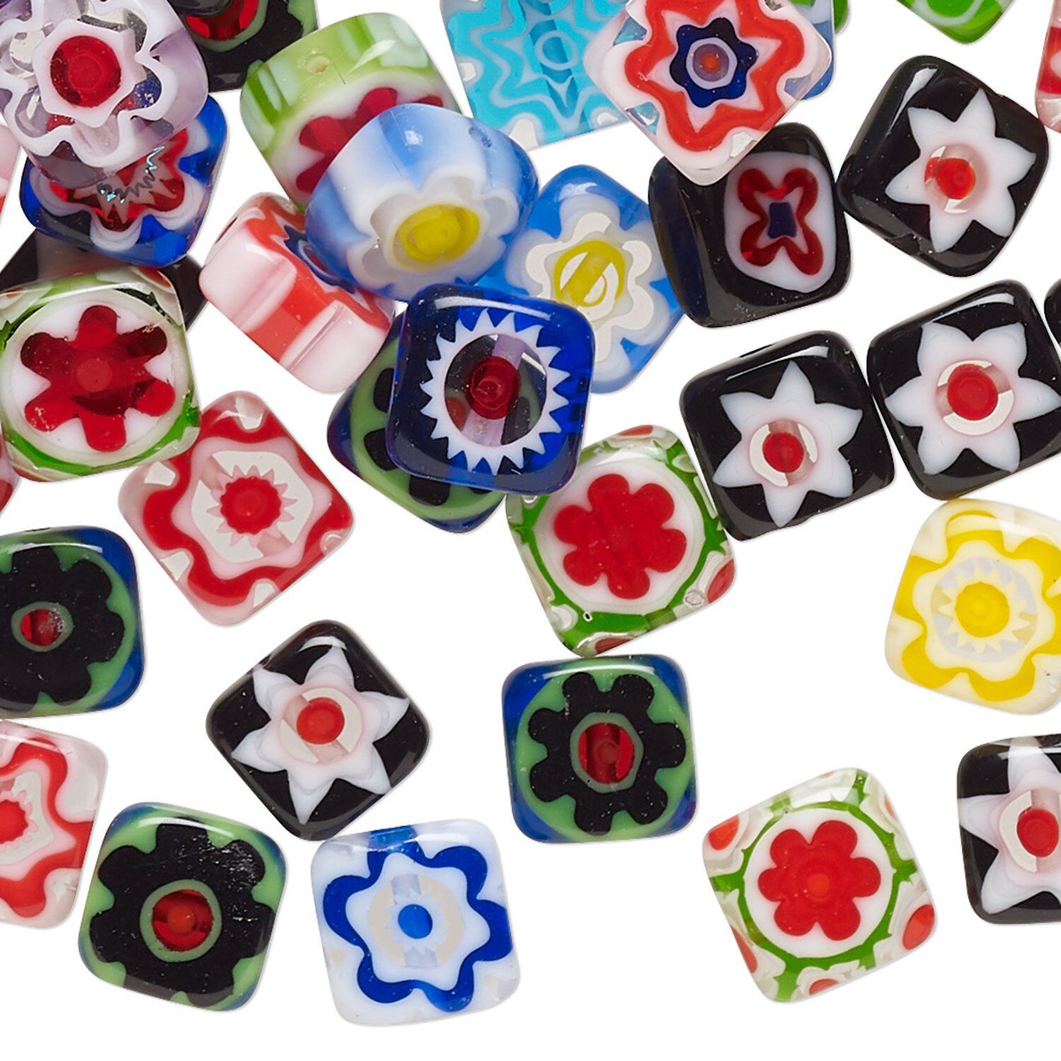 Bead mix, millefiori glass, opaque to transparent multicolored, 8mm flat square with 0.4-0.6mm hole. Sold per 2-ounce pkg, approximately 110-120 beads.