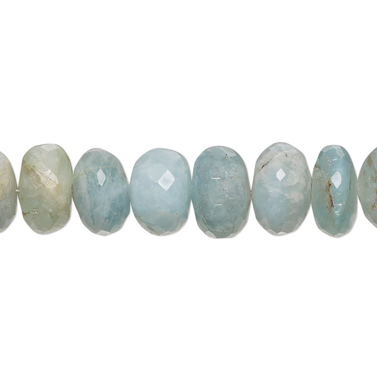 Bead, aquamarine (dyed / heated), 9x5mm-11x7mm hand-cut faceted rondelle with 0.4-1.4mm hole, C- grade, Mohs hardness 7-1/2 to 8. Sold per 8-inch strand.