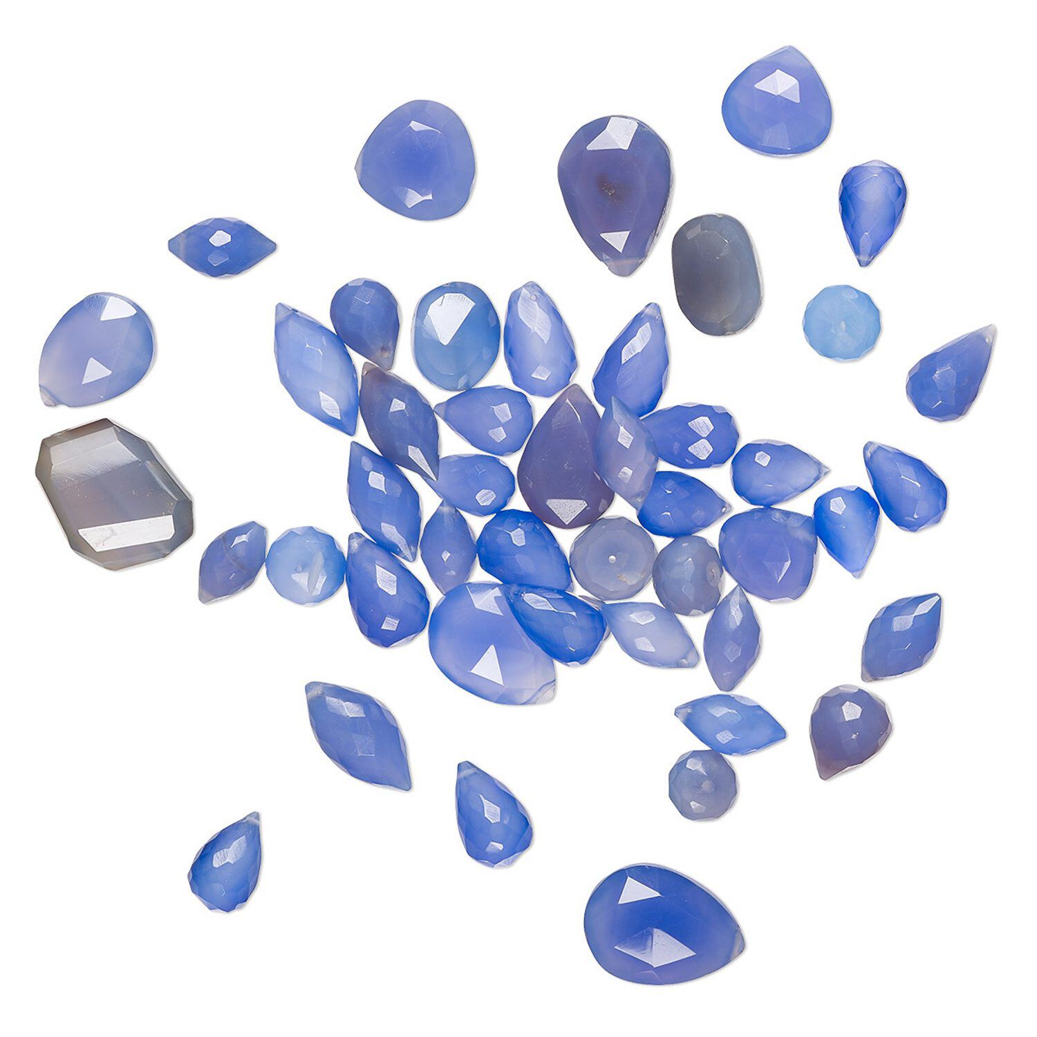 Bead mix, blue chalcedony (dyed / coated), light to dark, 5x3mm-15mm hand-cut top- and center-drilled faceted mixed shapes with 0.4-1.4mm hole, B- grade, Mohs hardness 6-1/2 to 7. Sold per 1-ounce pkg, approximately 60-70 beads.