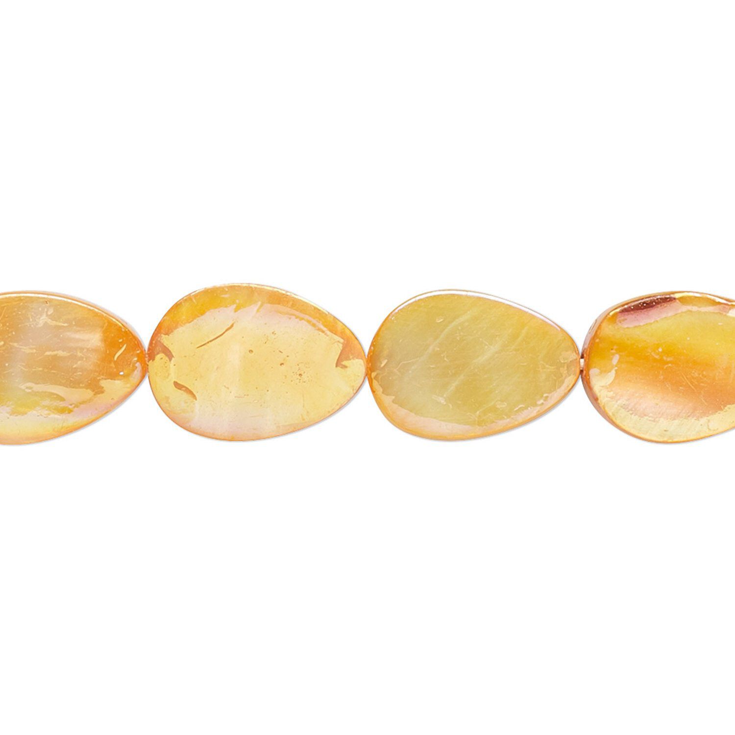 Bead, mother-of-pearl shell (dyed), orange AB, 13x9mm flat teardrop with 0.6-0.8mm hole, Mohs hardness 3-1/2. Sold per 15-1/2" to 16" strand.