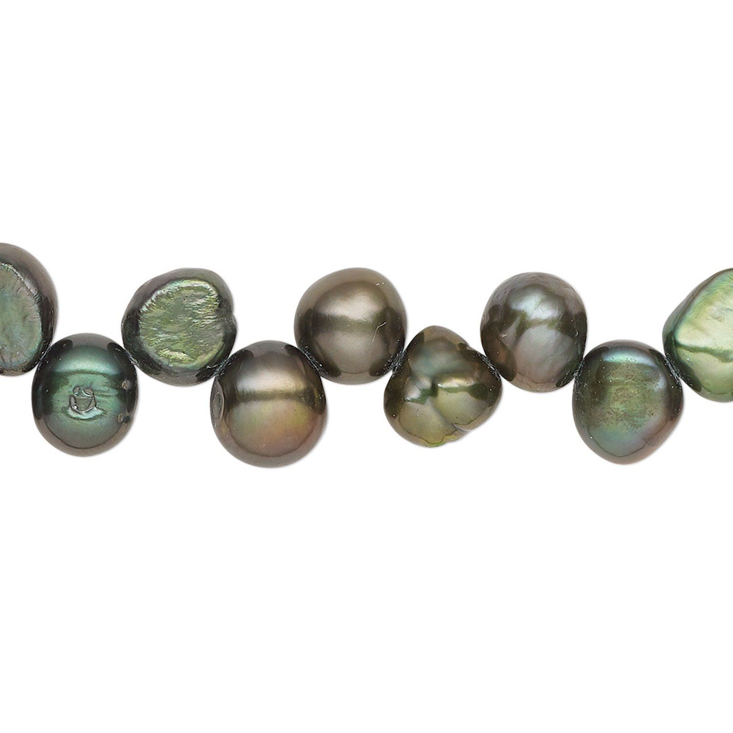 Pearl, cultured freshwater (dyed), dark forest green, 7-8mm top-drilled flat-sided potato with 0.4-0.5mm hole, D grade, Mohs hardness 2-1/2 to 4. Sold per 14-inch strand.