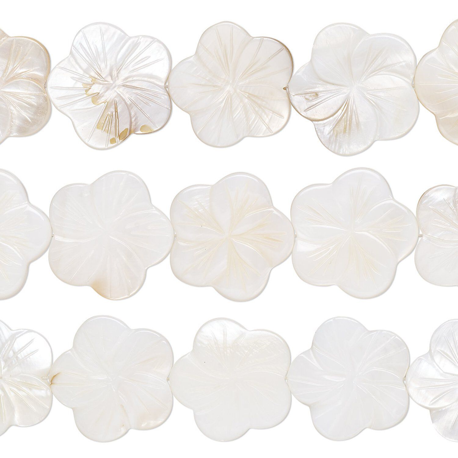Since shell is a natural material, shape, color and size will vary. Mother-of-pearl shell will vary in color from white to ivory in a variety of hues. Strand can include the occasional single-sided bead.