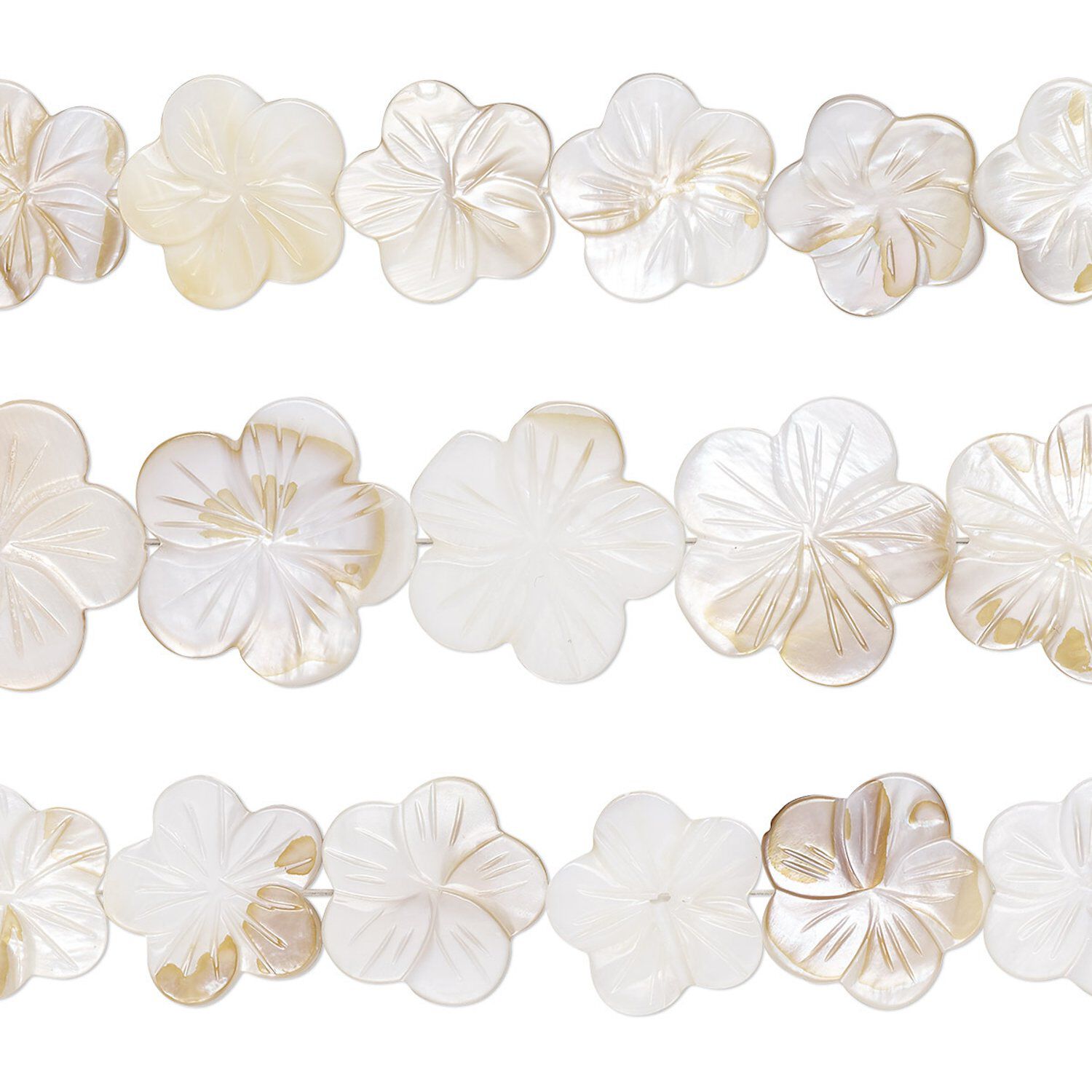 Since shell is a natural material, shape, color and size will vary. Mother-of-pearl shell will vary in color from white to ivory in a variety of hues. Strand can include the occasional single-sided bead.
