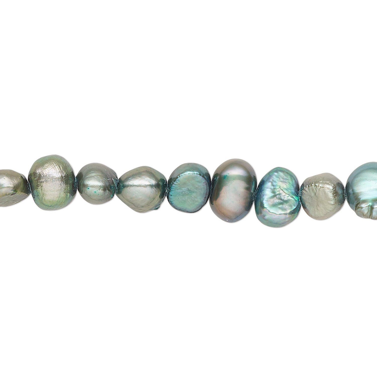 Pearl, cultured freshwater (dyed), iris green, 5-6mm flat-sided potato with 0.4-0.5mm hole, D grade, Mohs hardness 2-1/2 to 4. Sold per 15-inch strand.