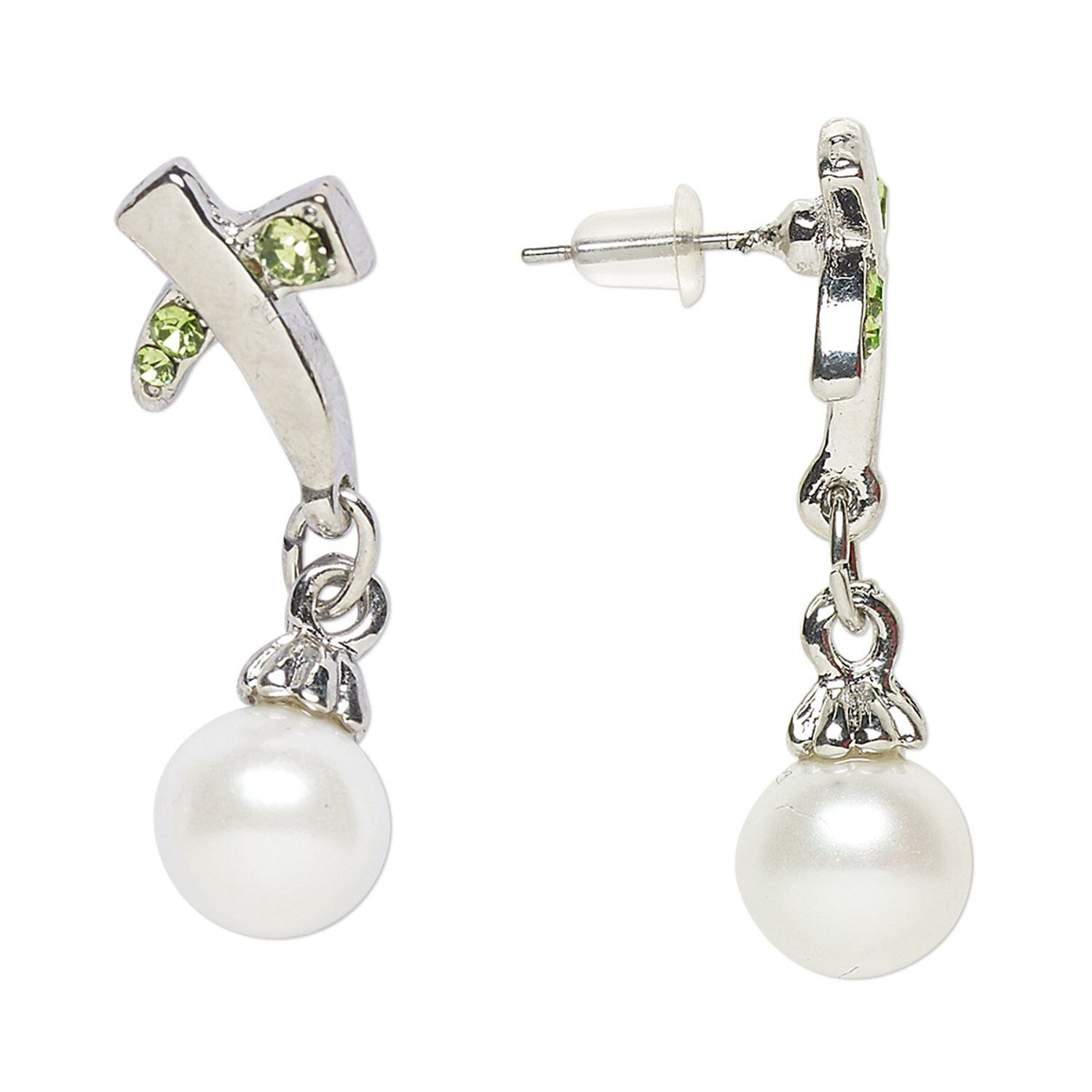 Earring, Everyday Jewelry, antique silver-finished "pewter" (zinc-based alloy) / glass / acrylic pearl, green and white, 34mm with post. Sold per pair.