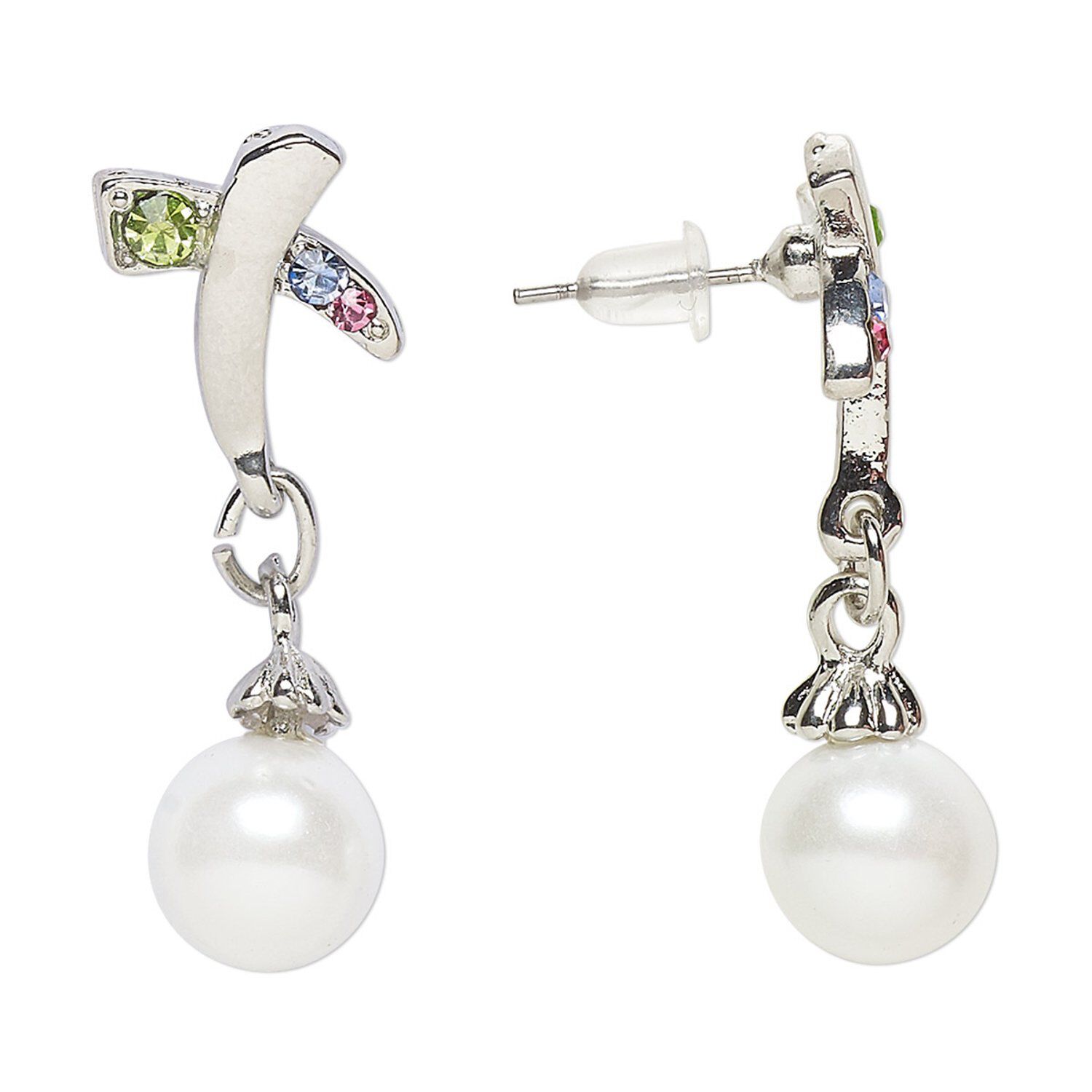 Earring, Everyday Jewelry, antique silver-finished "pewter" (zinc-based alloy) / glass / acrylic pearl, multicolored, 34mm with post. Sold per pair.