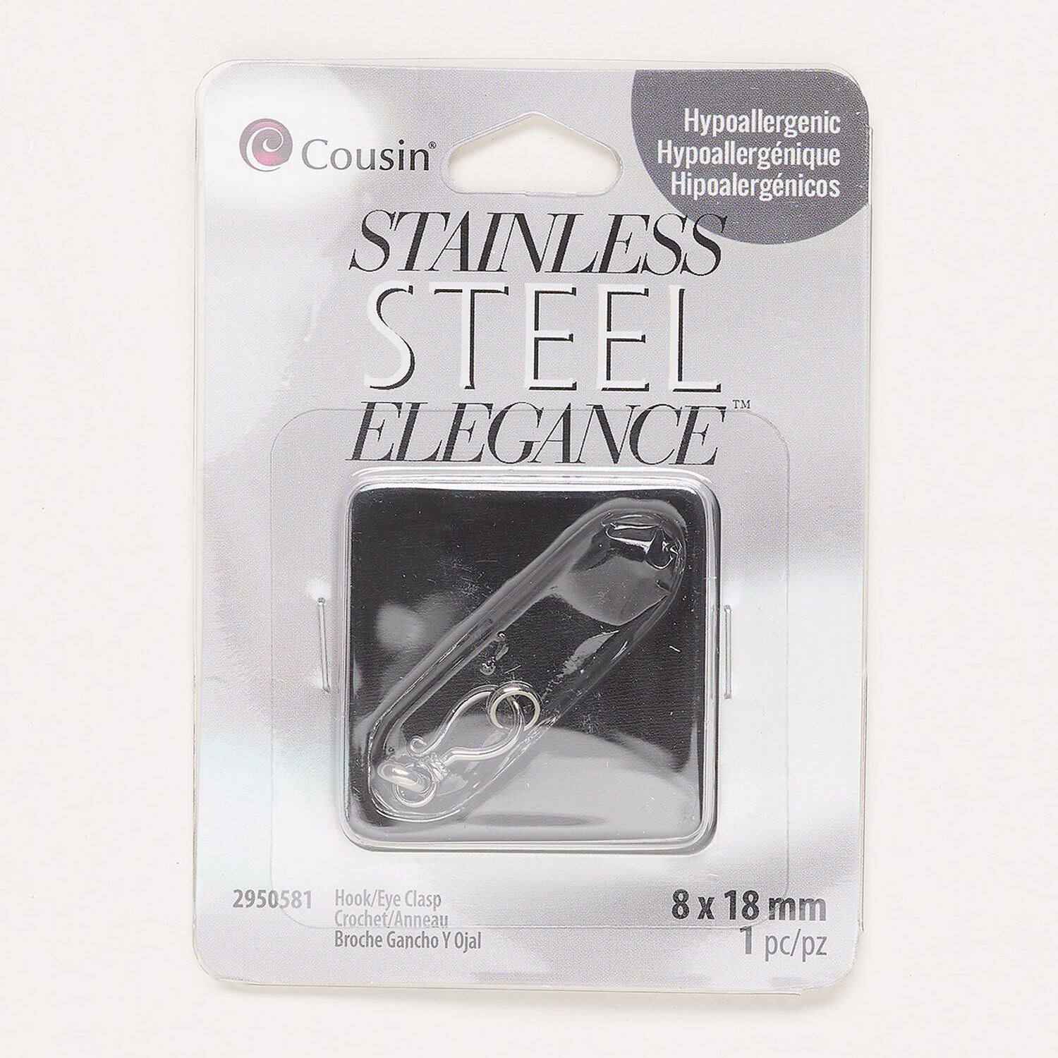 Clasp, hook-and-eye, stainless steel, 18x8mm. Sold individually.
