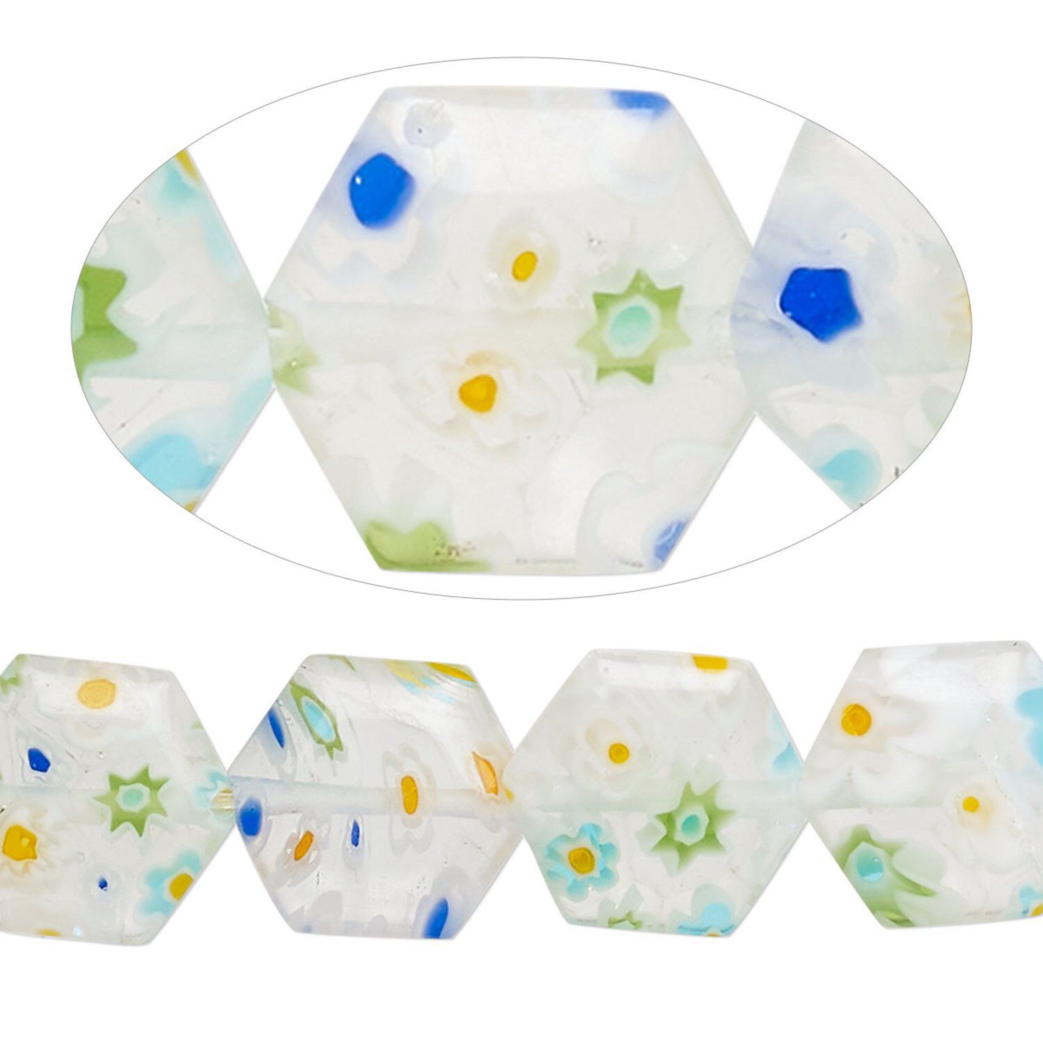 Bead, millefiori glass, translucent clear and multicolored, 12-13mm puffed hexagon with flower design. Sold per 14-inch strand.