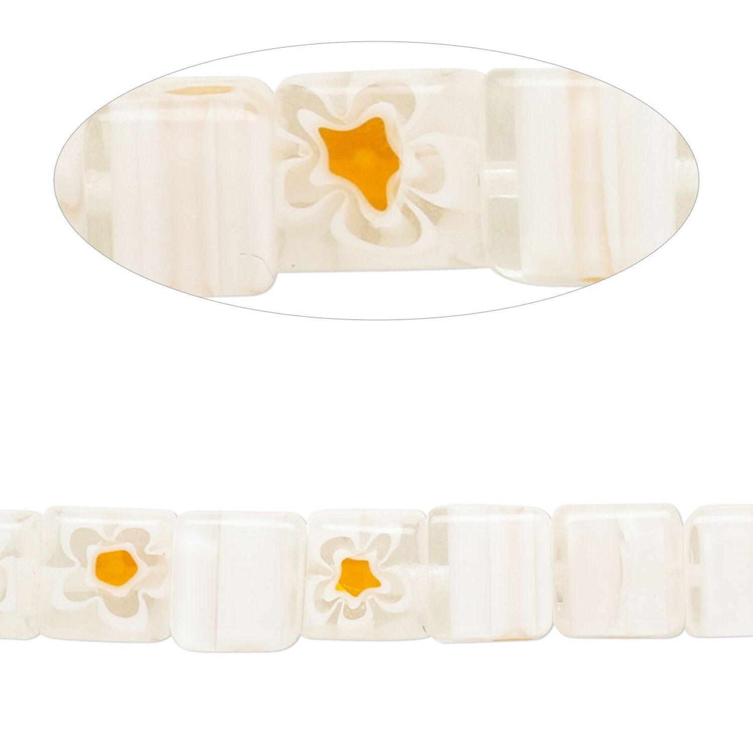 Bead, millefiori glass, translucent clear / white / orange, 7-9mm cube with flower and stripe design. Sold per 14-inch strand.