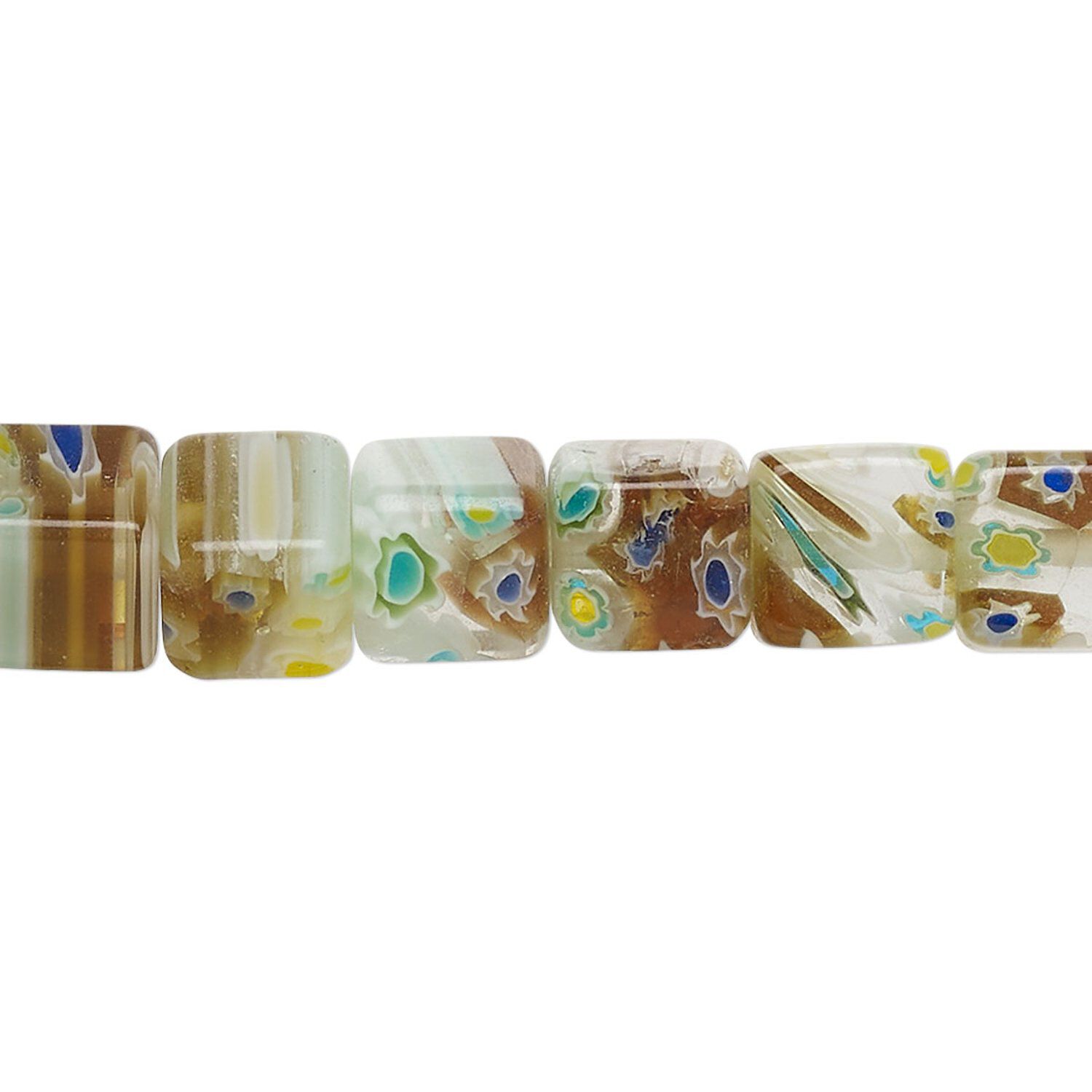 Bead, millefiori glass, clear / brown / multicolored, 7-9mm cube with flower/ sunburst / stripe design. Sold per 14-inch strand, approximately 50 beads.