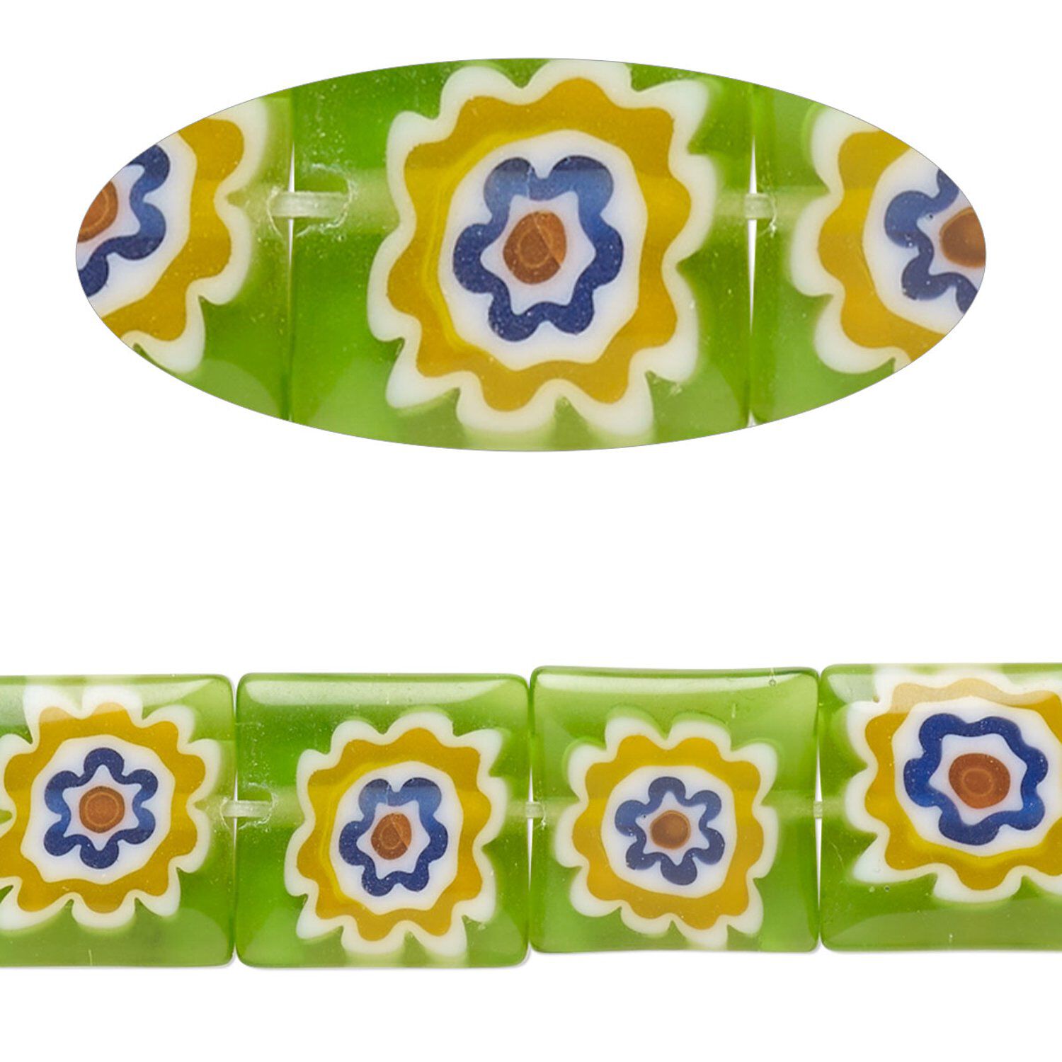 Bead, millefiori glass, translucent green and multicolored, 11mm-13x12mm puffed square with flower design. Sold per 14-inch strand.
