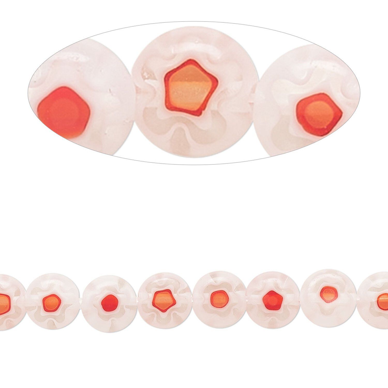 Bead, millefiori glass, translucent red / white / clear, 6mm puffed flat round with flower and design. Sold per 14-inch strand.
