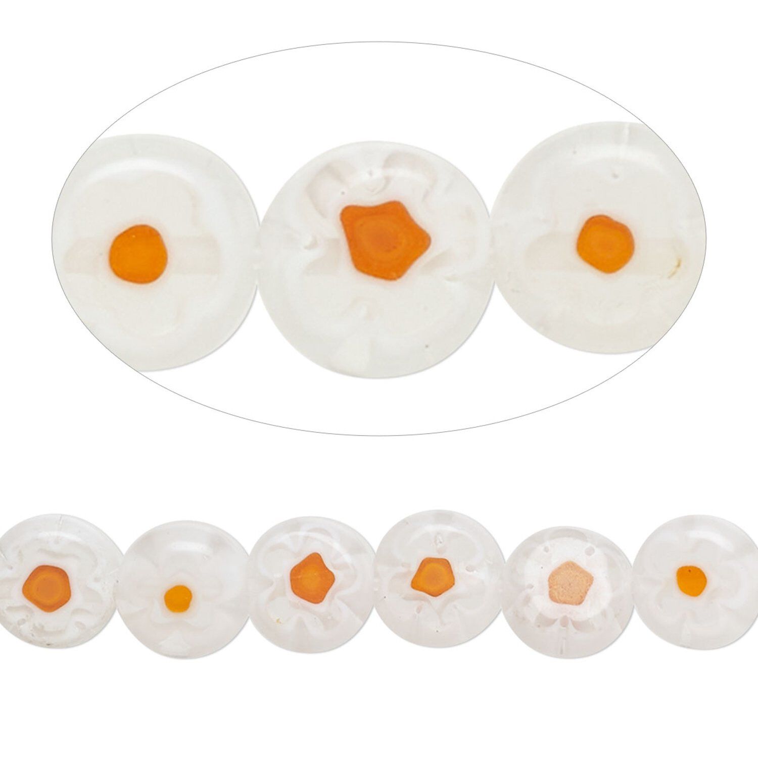 Bead, millefiori glass, translucent orange / clear / white, 8mm puffed flat round with flower design. Sold per 14-inch strand.