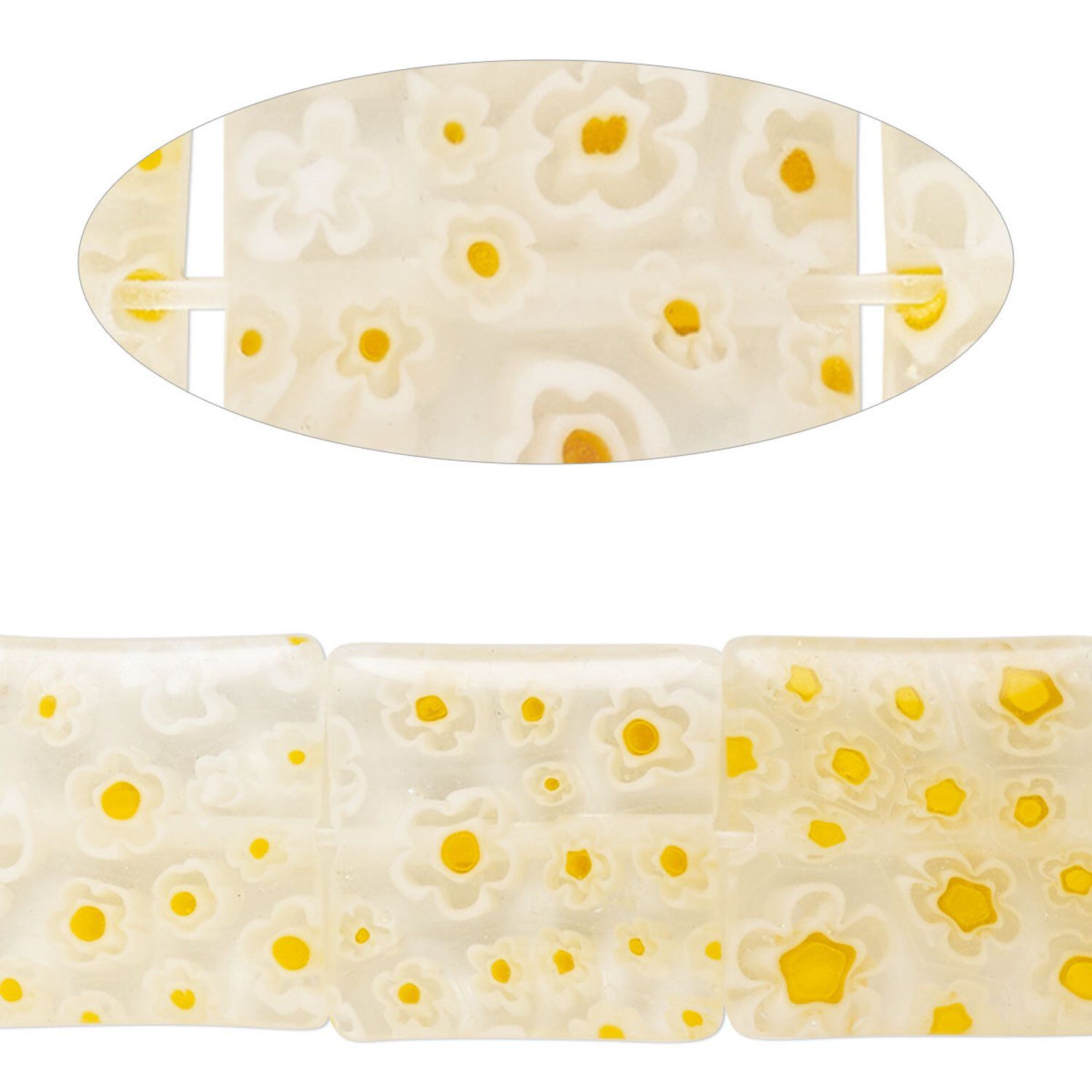 Bead, millefiori glass, translucent clear / white / orange, 15mm-17x16mm puffed square with flower design. Sold per 14-inch strand.