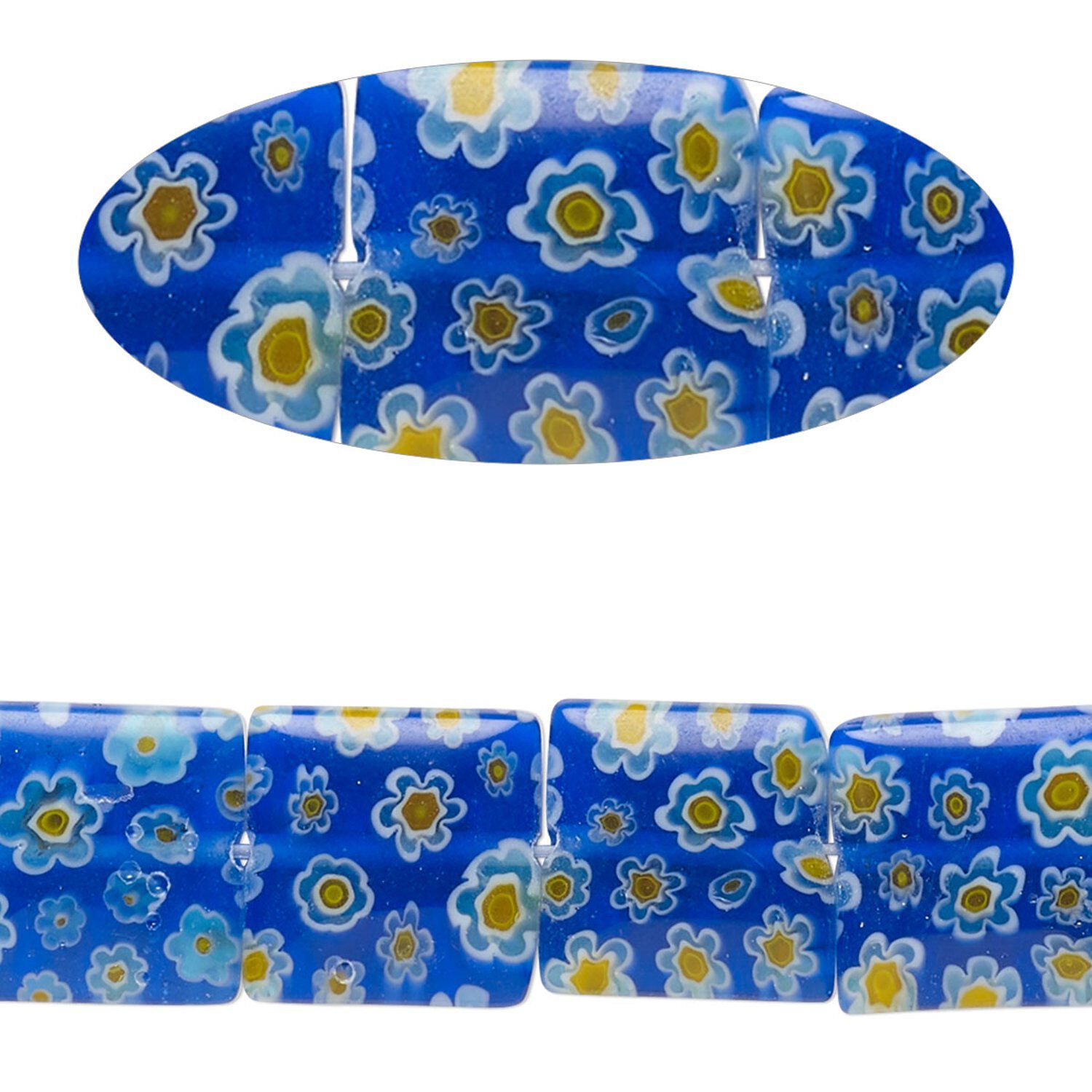 Bead, millefiori glass, translucent blue / white / yellow, 11mm-13x12mm puffed square with flower design. Sold per 14-inch strand.