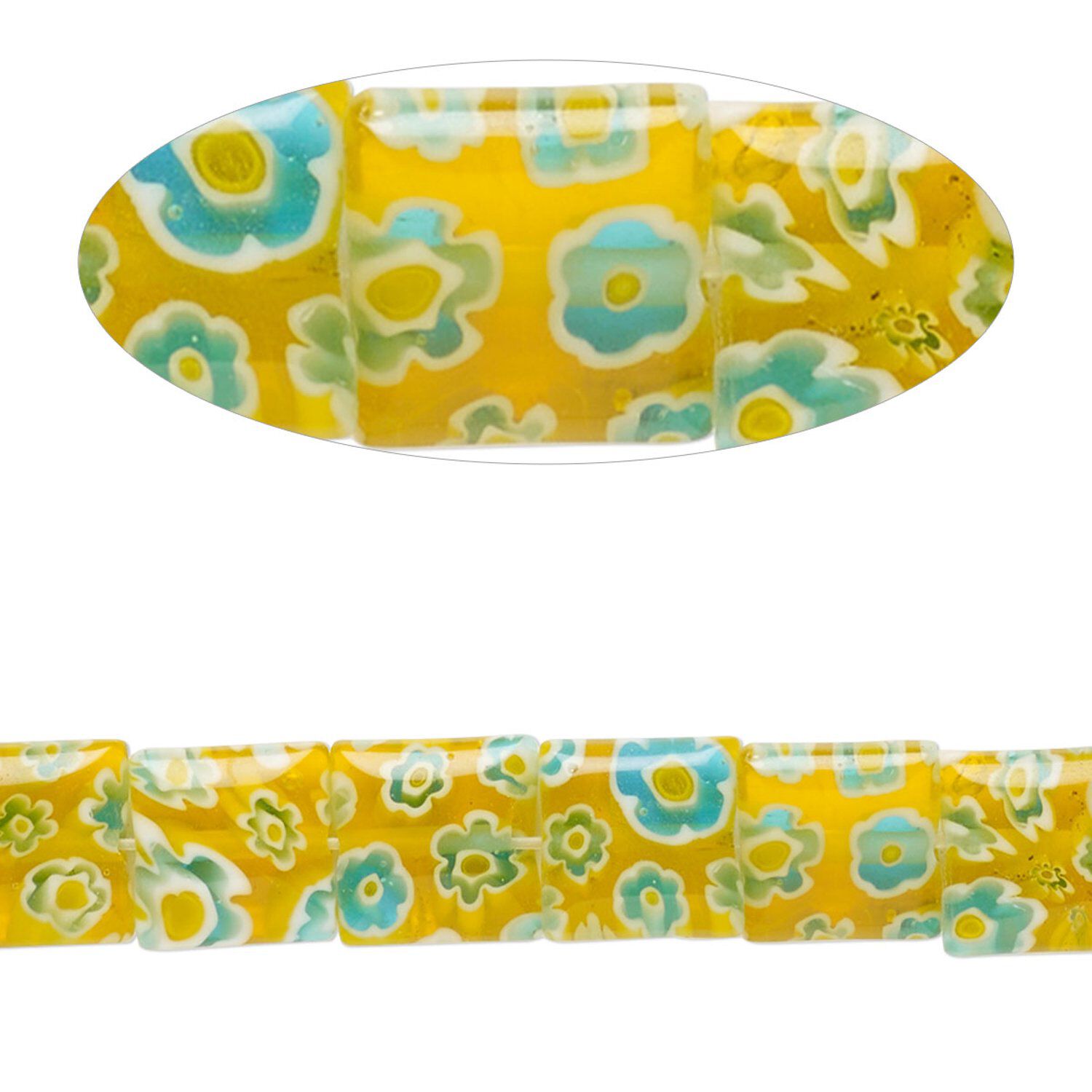 Bead, millefiori glass, translucent yellow / blue / white, 7mm-9x8mm puffed square with flower design. Sold per 14-inch strand.