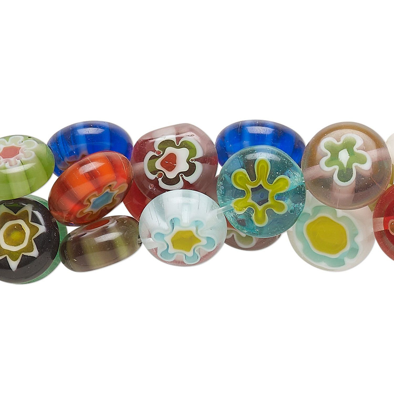 Bead mix, millefiori glass, translucent multicolored, puffed flat round 9-11mm with flower design. Sold per (3) 14-inch strands.