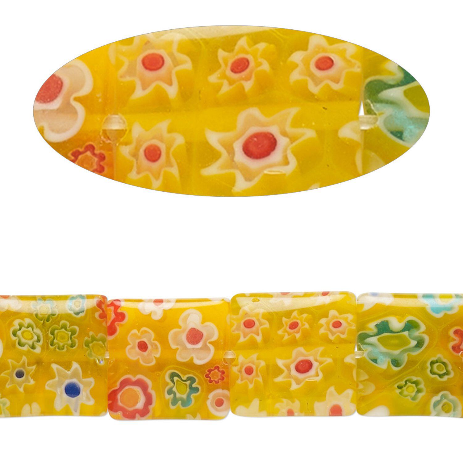 Bead, millefiori glass, translucent yellow and multicolored, 11mm-13x12mm puffed square with flower design. Sold per 14-inch strand.