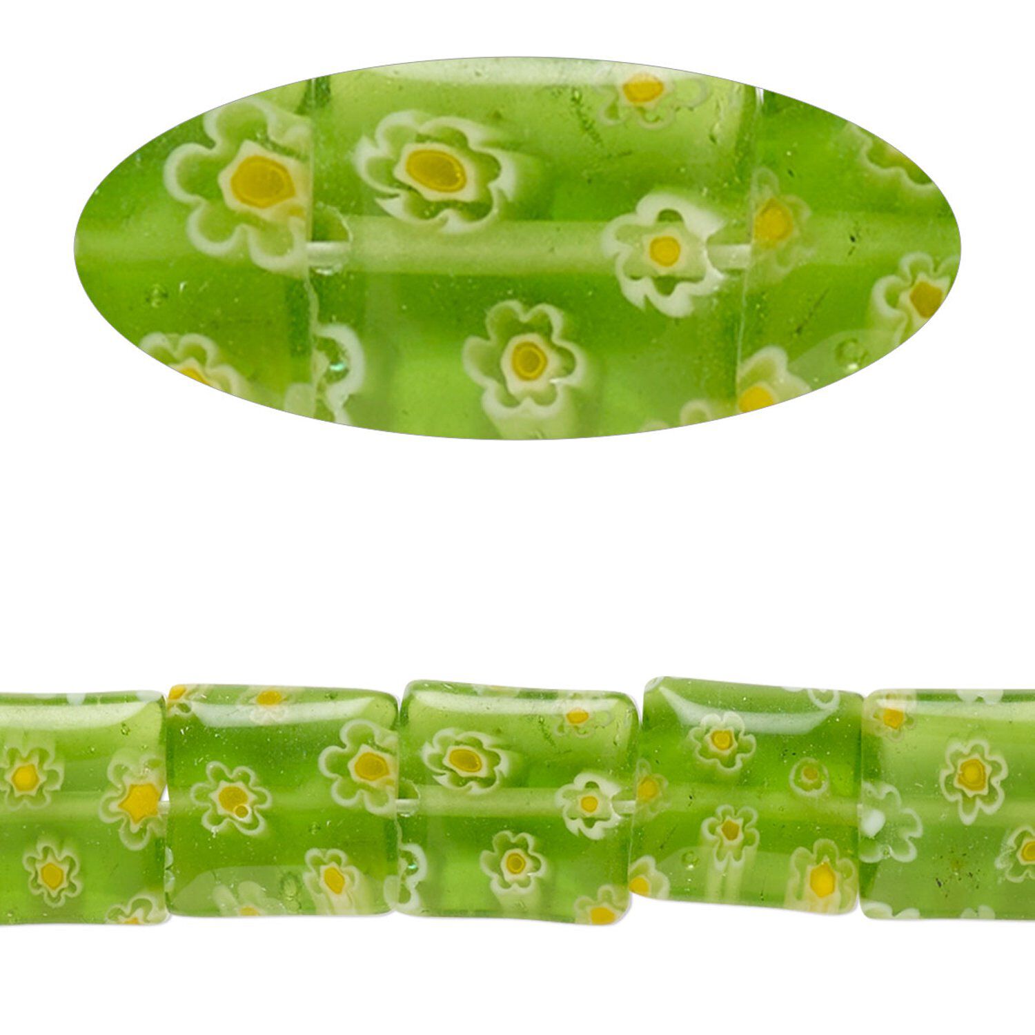 Bead, millefiori glass, translucent spring green and multicolored, 9mm-11x10mm puffed square with flower design. Sold per 14-inch strand, approximately 40 beads.