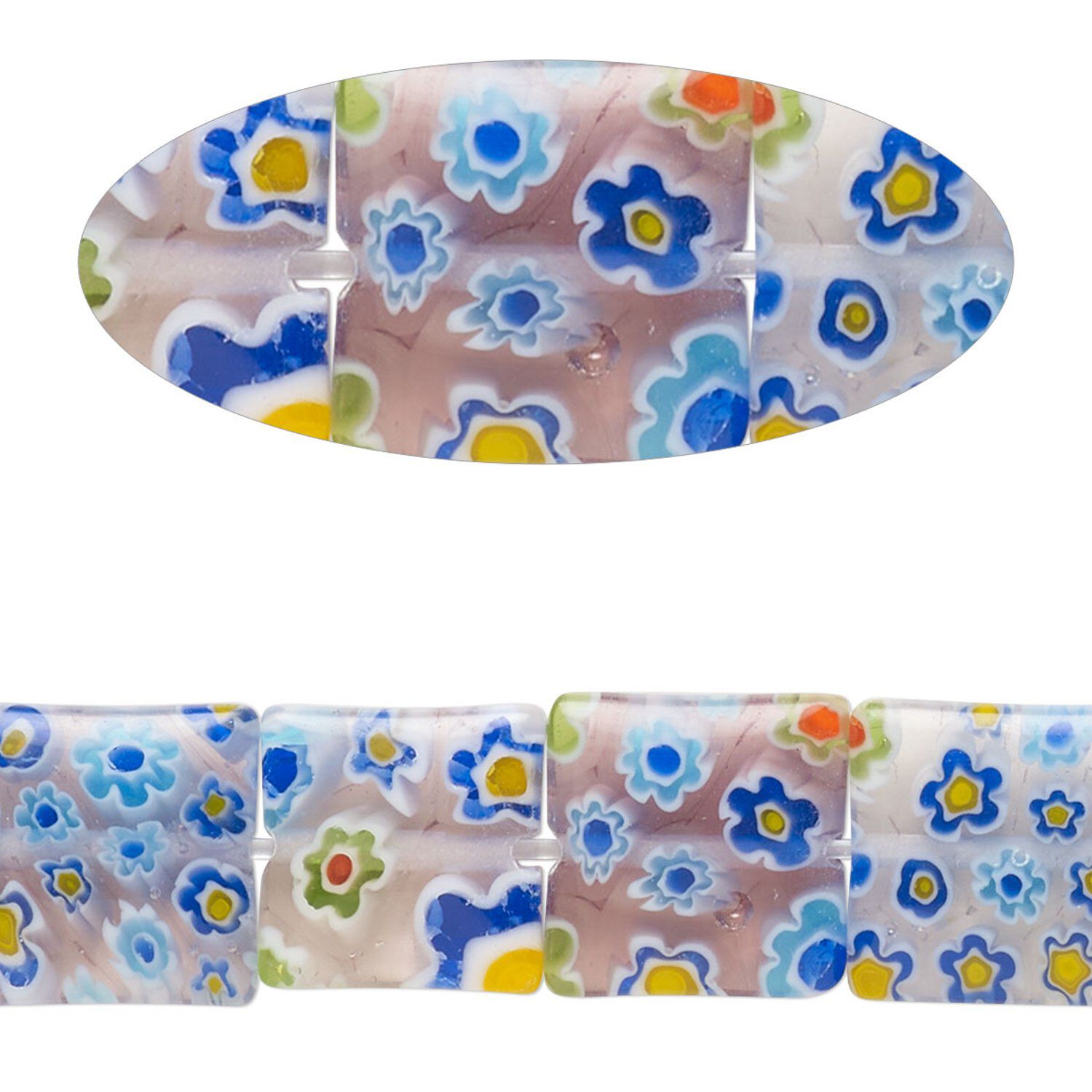 Bead, millefiori glass, translucent light pink / light purple / multicolored, 11mm-13x12mm puffed square. Sold per 14-inch strand, approximately 30 beads.