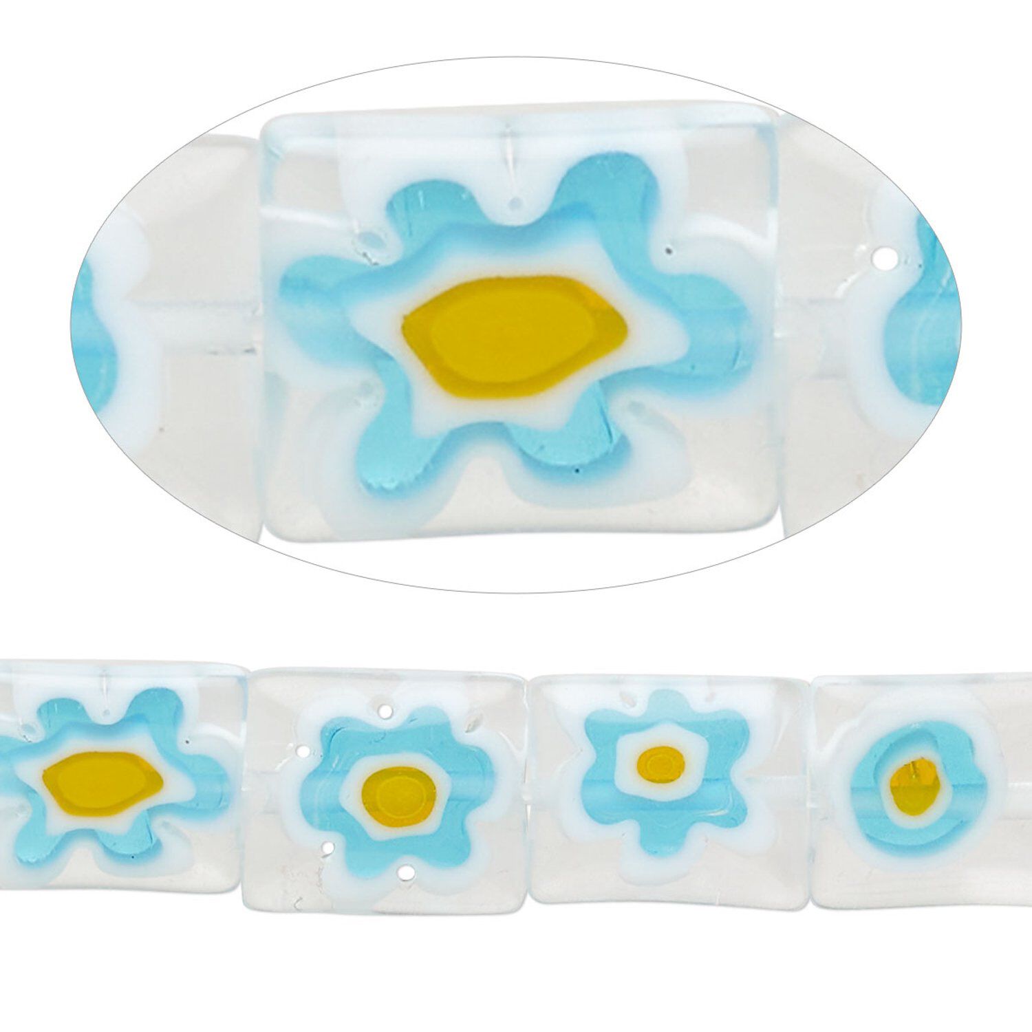 Bead, millefiori glass, translucent light blue / white / golden yellow, 12x10mm puffed rectangle with flower design. Sold per 14-inch strand.