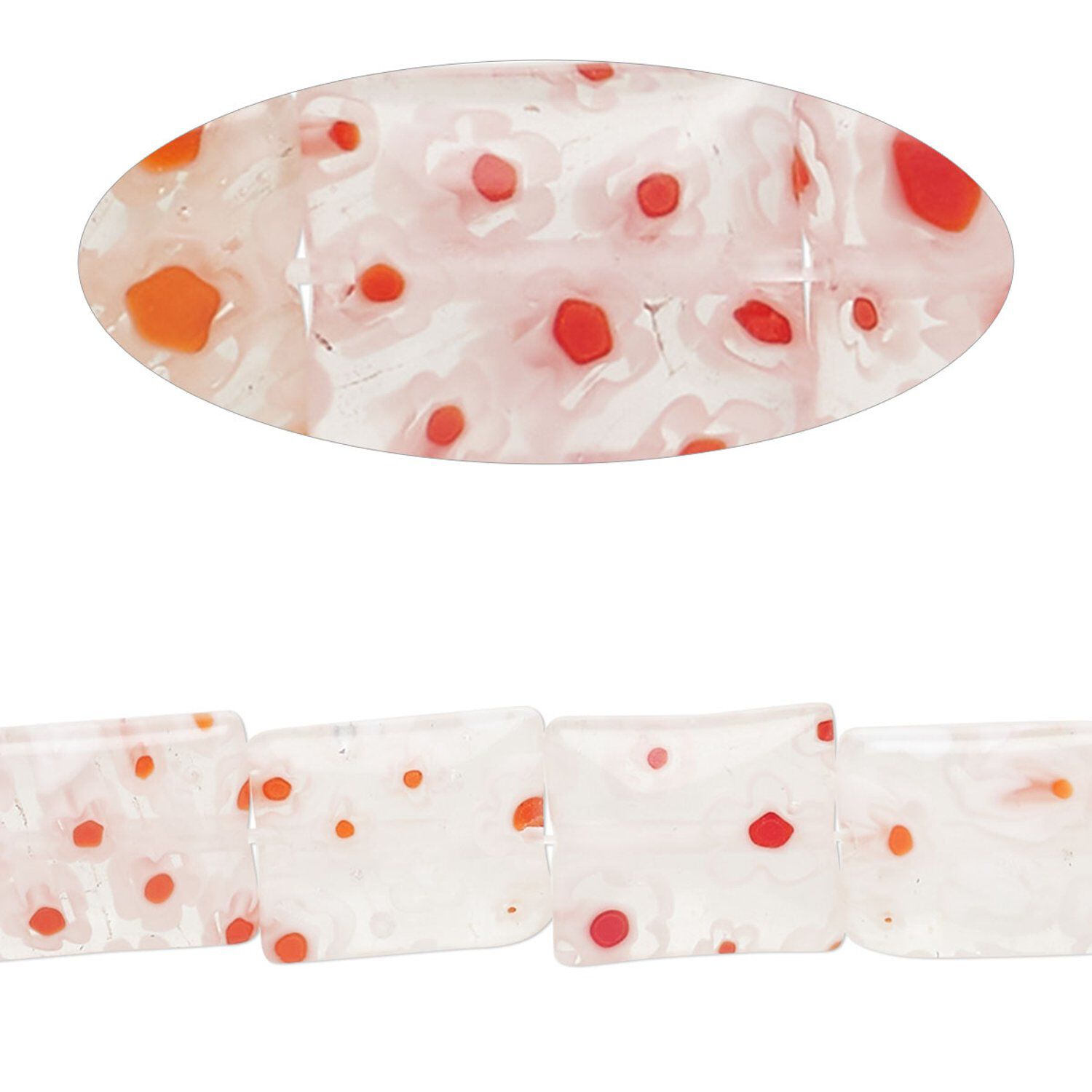 Bead, millefiori glass, translucent dark red / orange / white / clear, 12x10mm puffed rectangle with flower design. Sold per 14-inch strand.