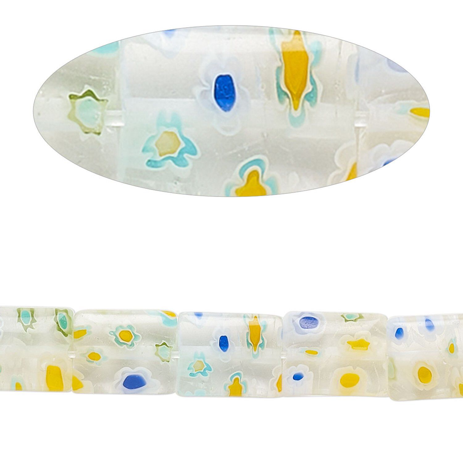Bead, millefiori glass, clear and multicolored, 9x7mm-10x8mm puffed rectangle. Sold per 14-inch strand.