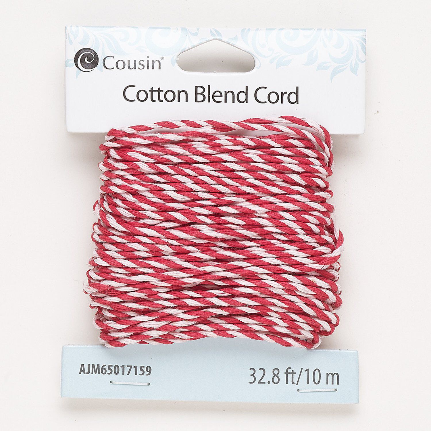 Cord, cotton, red and white, 1.5mm twisted. Sold per 10-meter pkg.