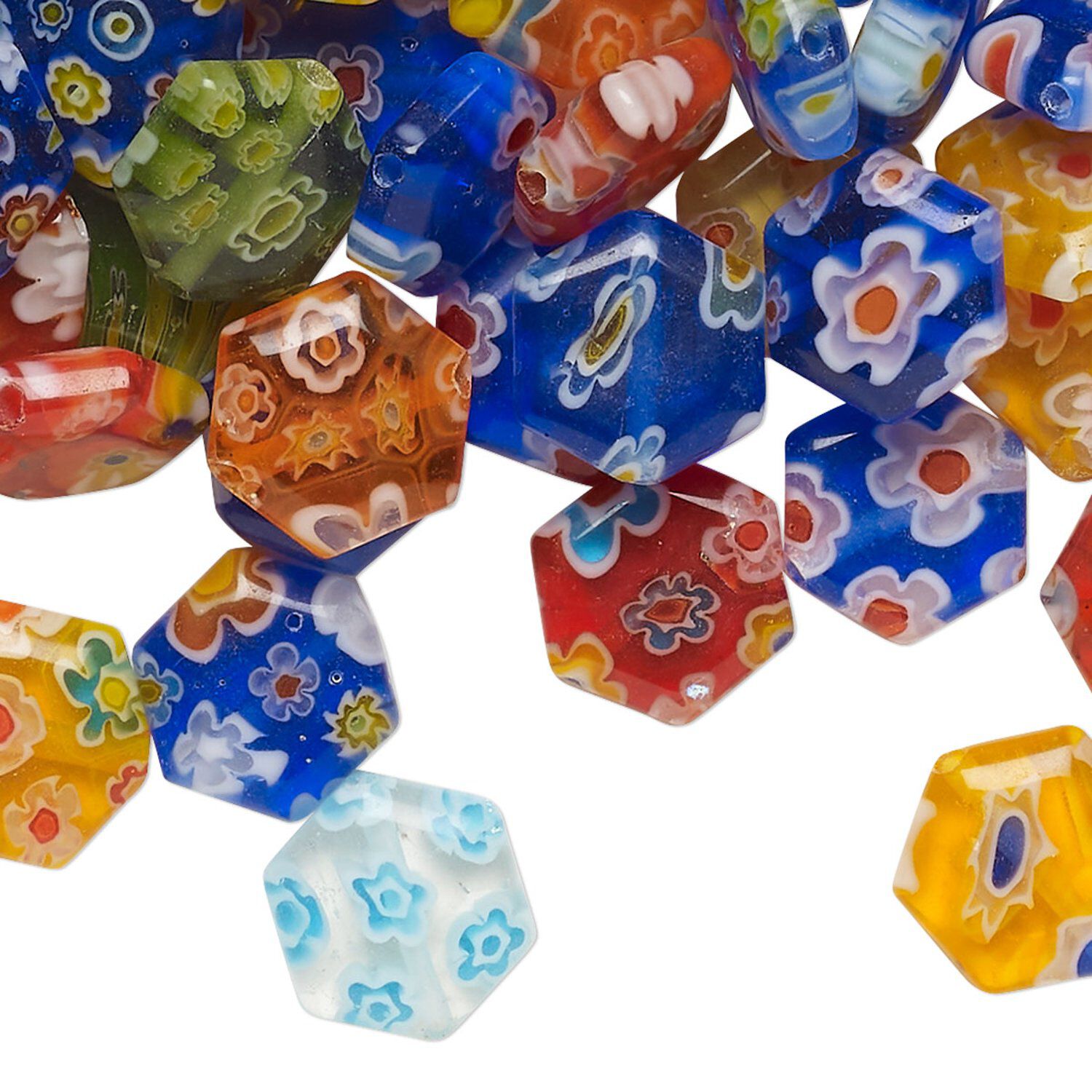 Bead mix, millefiori glass, translucent and transparent multicolored, 9-11mm puffed hexagon. Sold per 2oz pkg, approximately 90 beads.