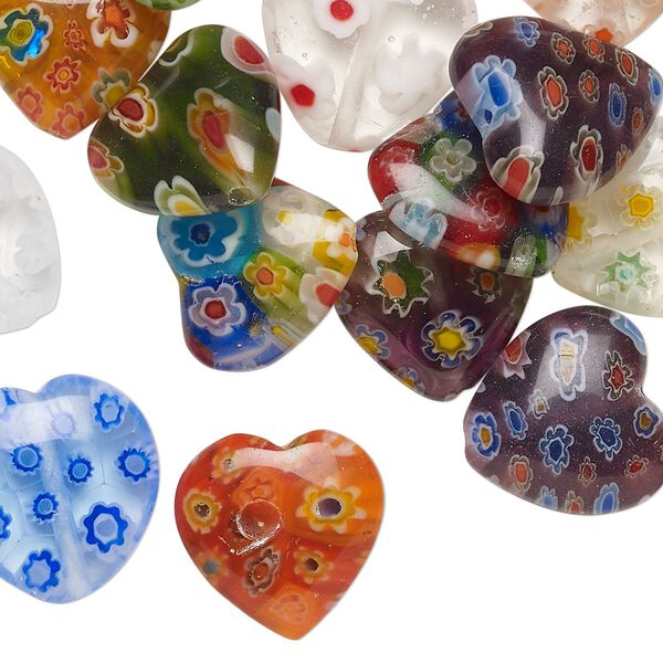 Bead mix, millefiori glass, translucent and transparent multicolored, 15-17mm puffed heart. Sold per 2-ounce pkg, approximately 30 beads.