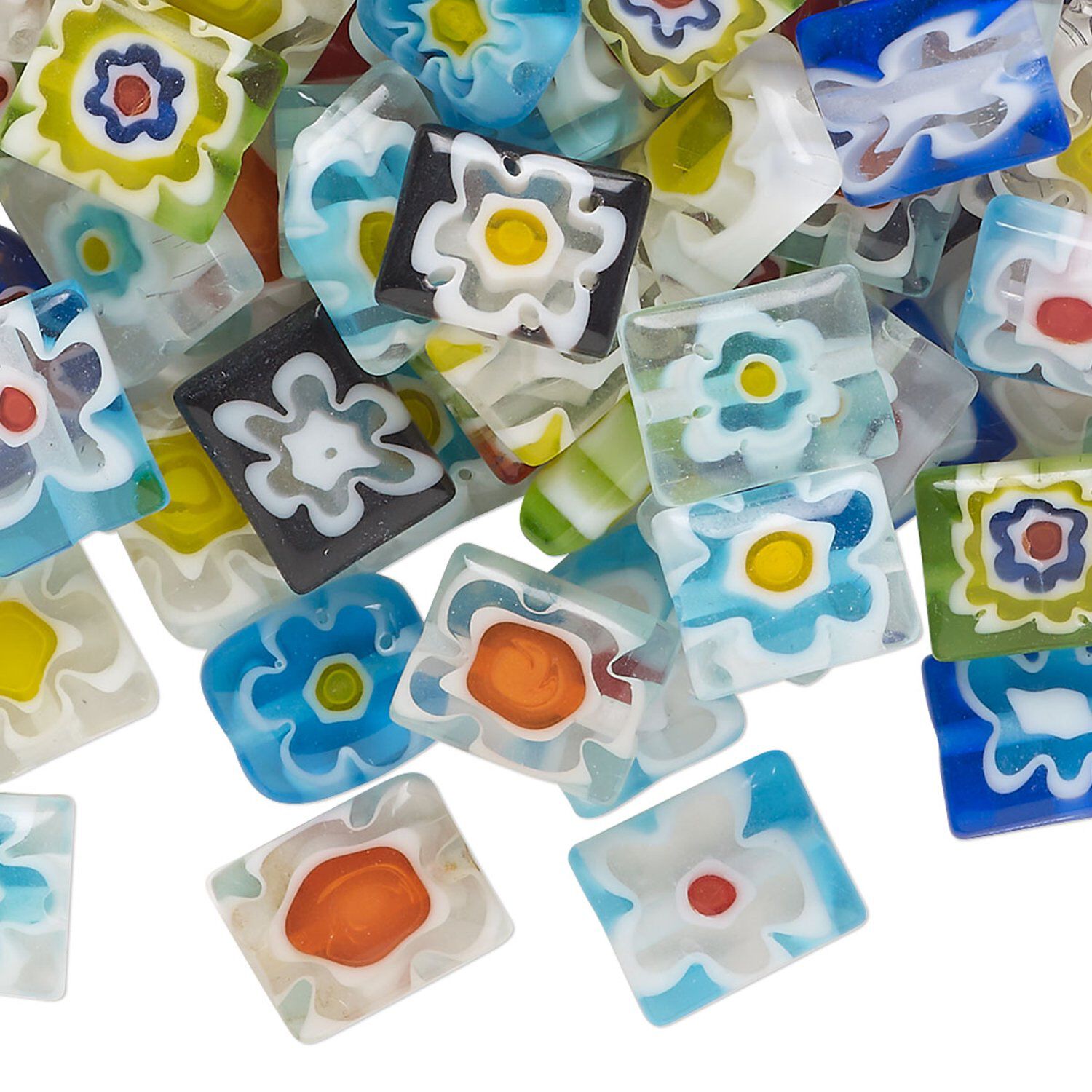 Bead mix, millefiori glass, translucent and transparent multicolored, 9x7mm-11x8mm puffed rectangle. Sold per 2-ounce pkg, approximately 100 beads.
