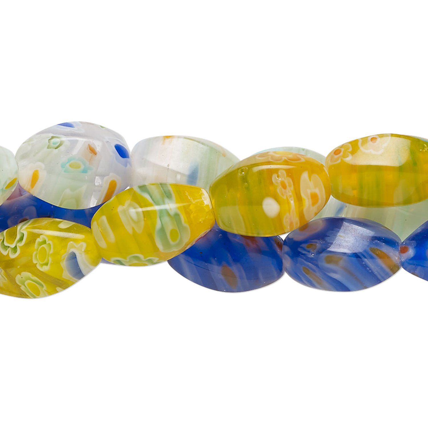 Bead, millefiori glass, translucent multicolored, 11x7mm-12x8mm 6-sided twisted oval. Sold per pkg of (3) 14-inch strands.