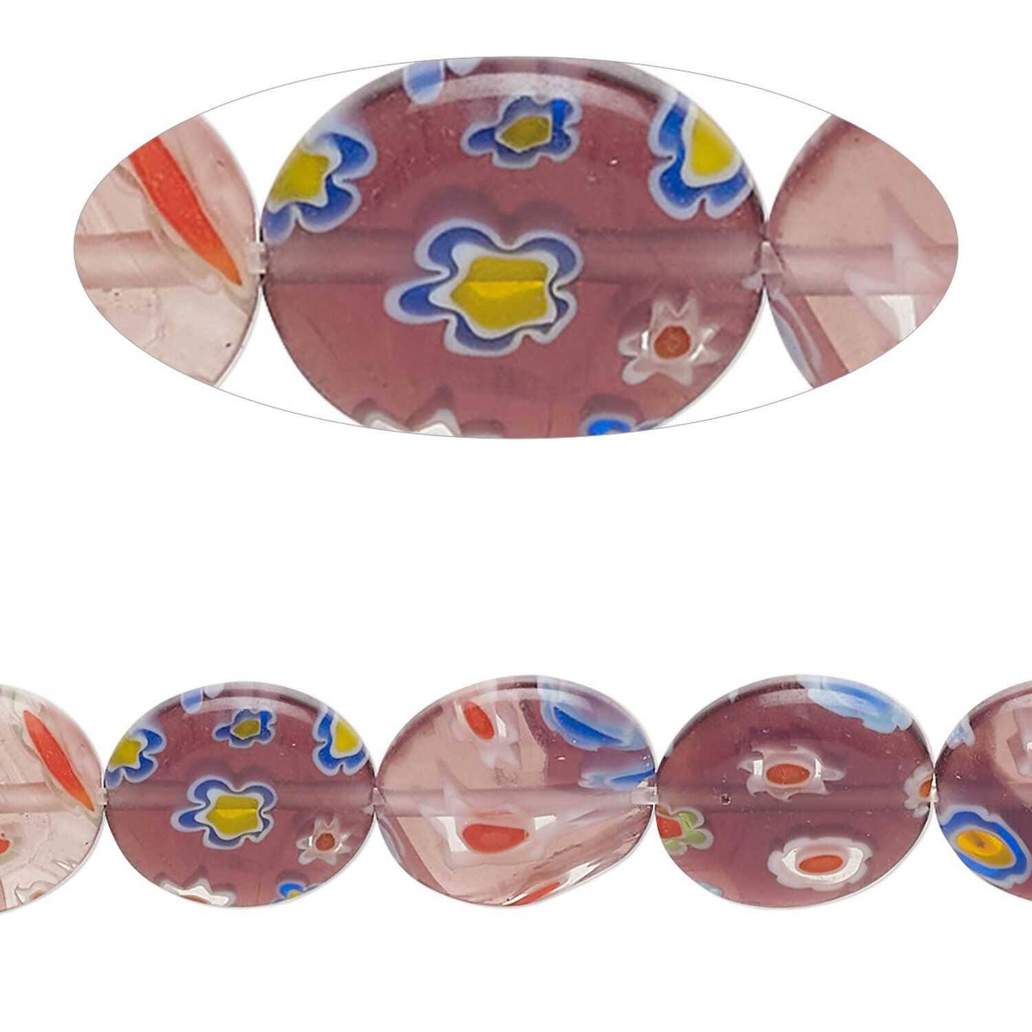 Bead, millefiori glass, translucent purple and multicolored, 11x9mm-12x10mm puffed oval with flower design. Sold per 14-inch strand, approximately 35 beads.