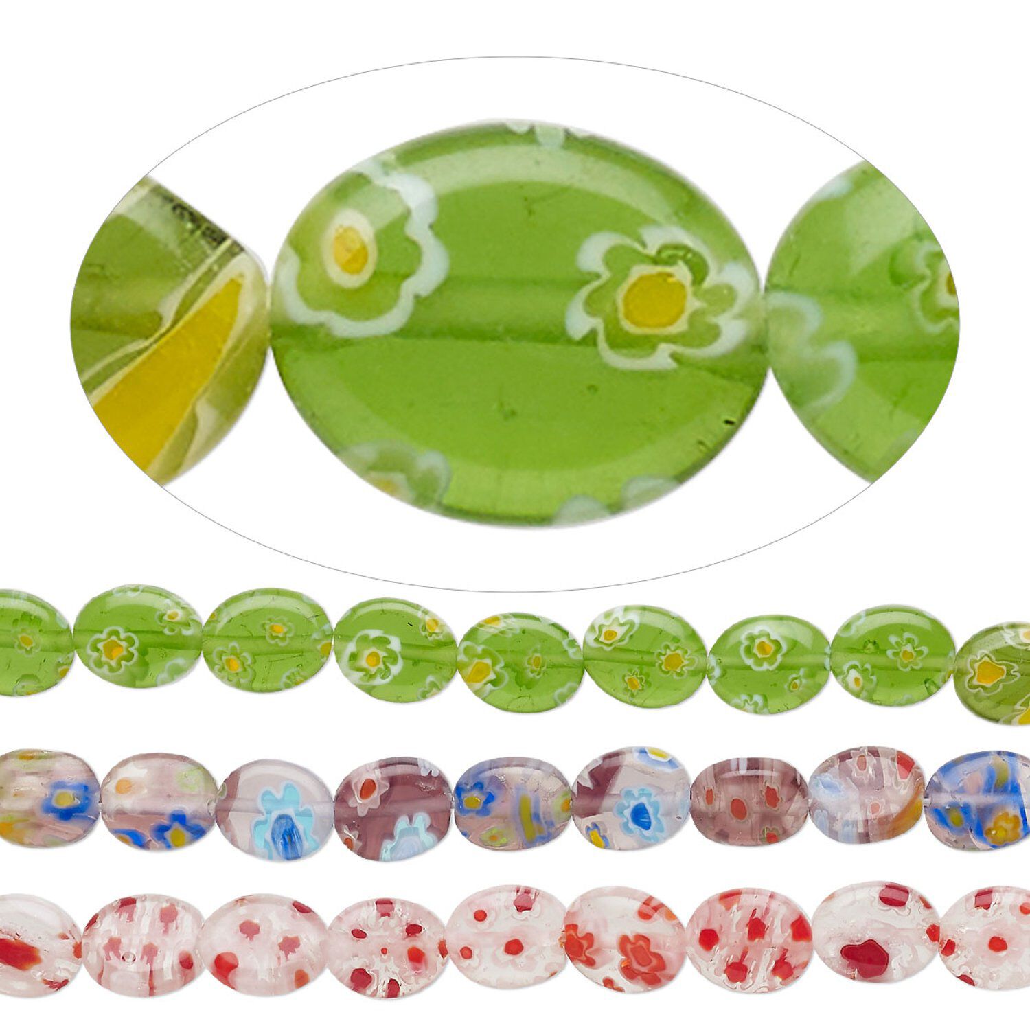 Bead, millefiori glass, translucent multicolored, 10x8mm puffed oval with flower design. Sold per pkg of (3) 14-inch strands.