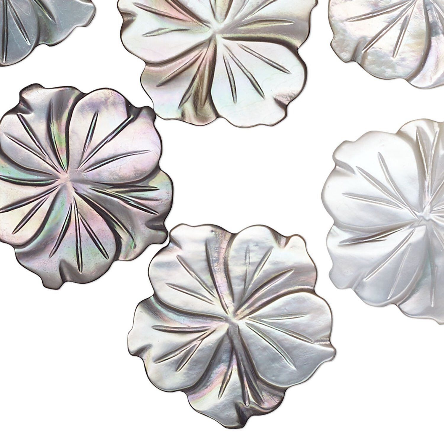 Component mix, black lip shell (natural), 20-21mm undrilled carved flower. Mohs hardness 3-1/2. Sold per pkg of 10.