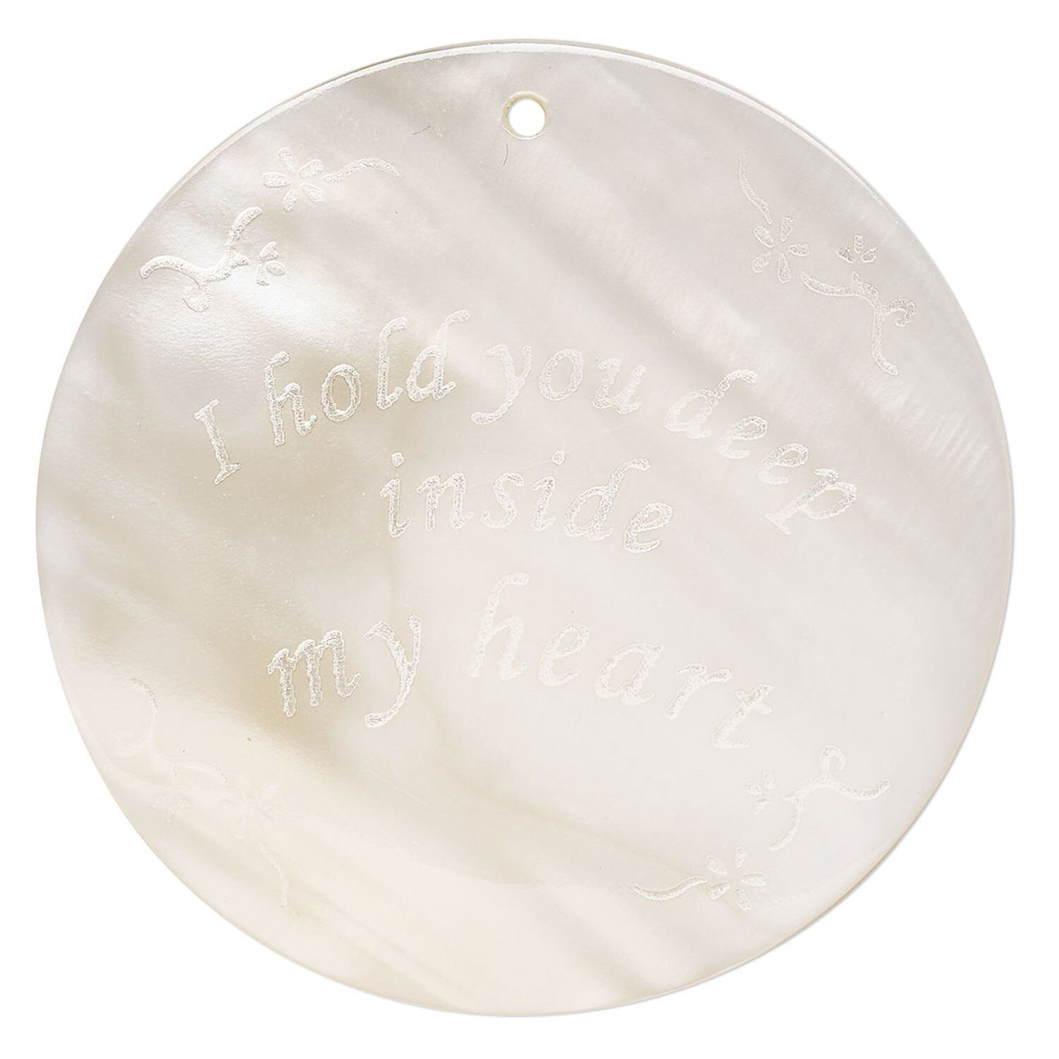 Focal, mother-of-pearl shell (natural), 55mm single-sided round with "I Hold You Deep Inside My Heart," Mohs hardness 3-1/2. Sold individually.