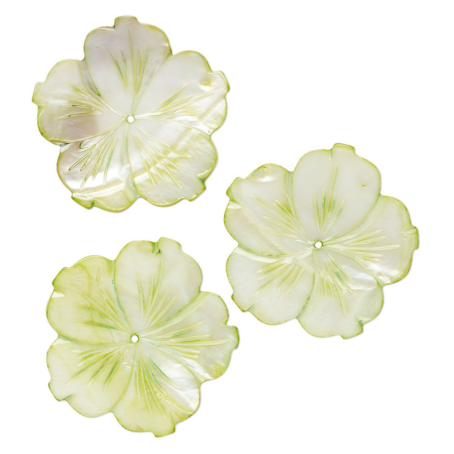 Focal, mother-of-pearl shell (dyed), green, 56.5mm single-sided carved flower, Mohs hardness 3-1/2. Sold per pkg of 3.