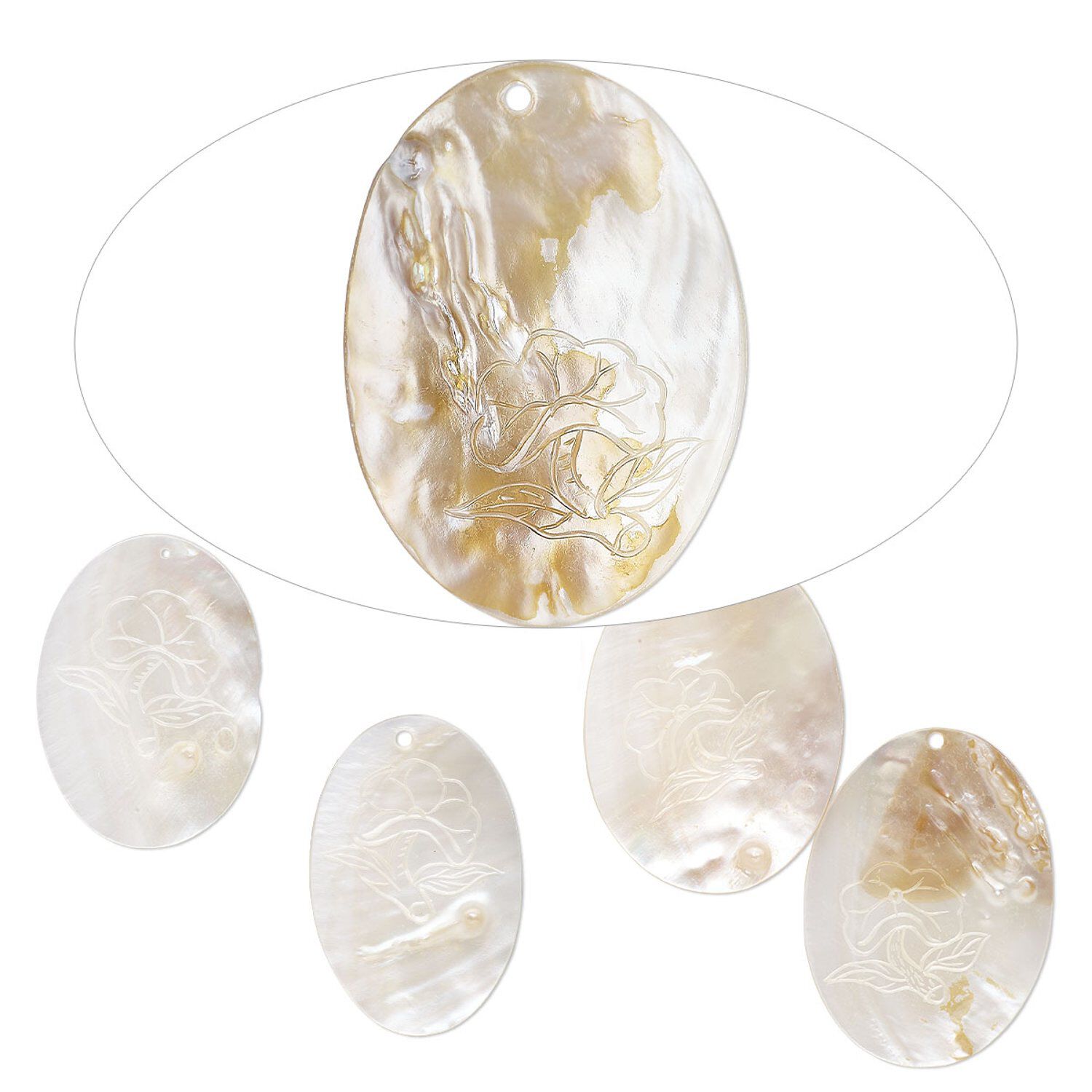 Focal, mother-of-pearl shell (natural/bleached), 61x40mm-70x49mm hand-carved oval with flower design, Mohs hardness 3-1/2. Sold per pkg of 5.