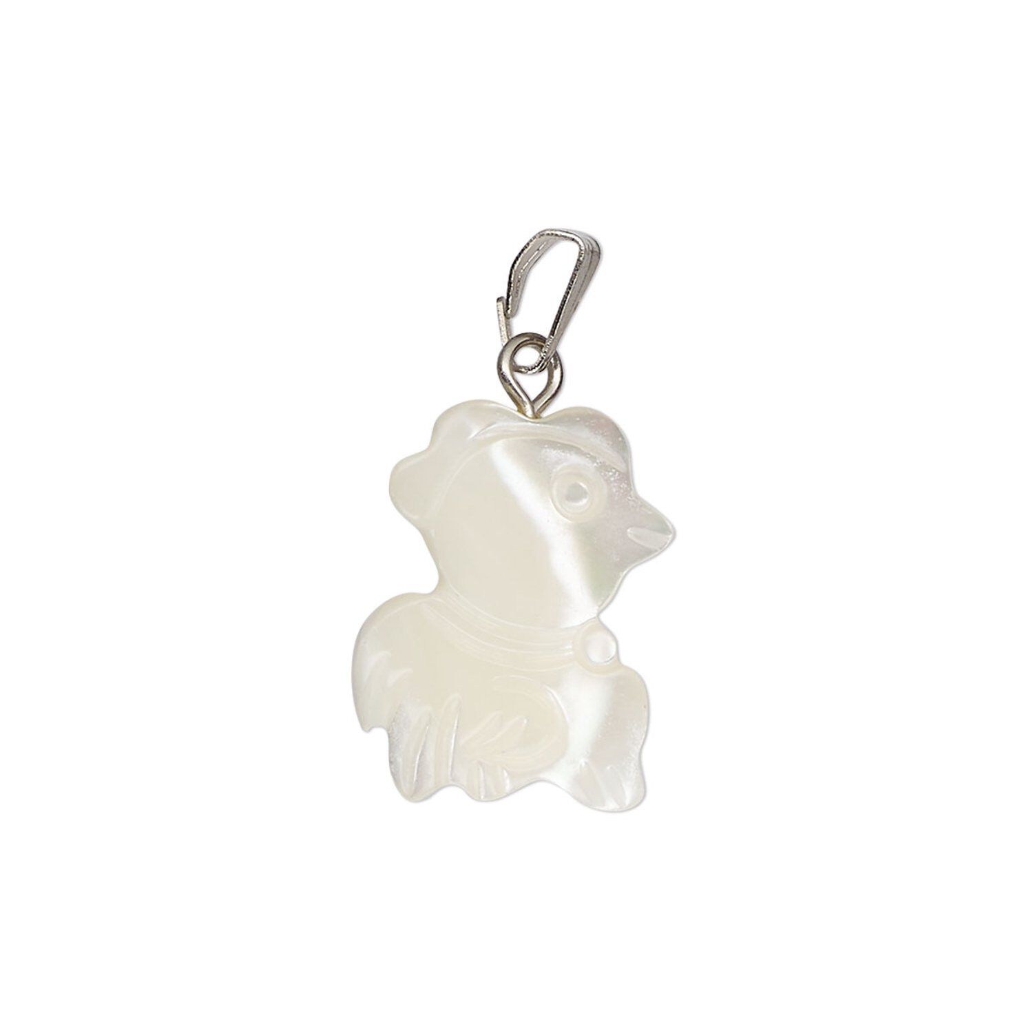 Pendant, mother-of-pearl shell (bleached) / antique silver-finished "pewter" (zinc-based alloy) / steel, 16x10mm-17x12mm single-sided carved chicken. Sold individually.