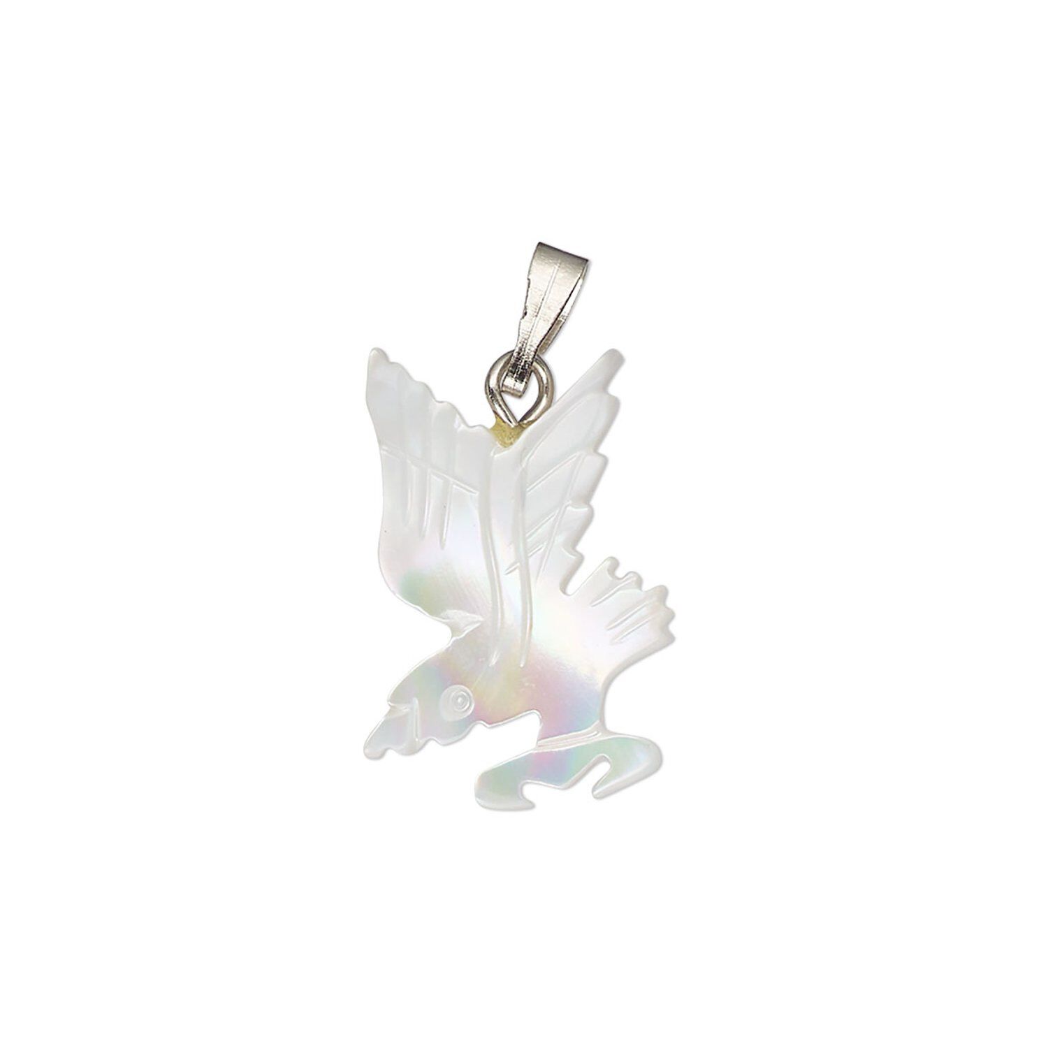 Pendant, mother-of-pearl shell (bleached) / antique silver-finished "pewter" (zinc-based alloy) / steel, 17x13mm-21x15mm single-sided carved bird. Sold individually.