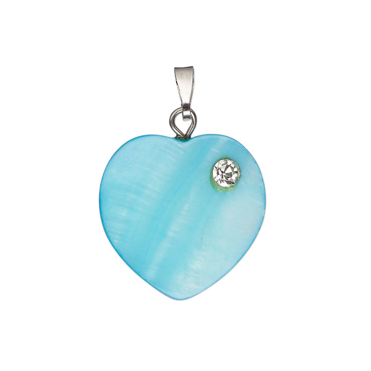 Pendant, antique silver-finished "pewter" (zinc-based alloy) / steel / glass rhinestone / mother-of-pearl shell (dyed), blue, 20mm heart. Sold individually.